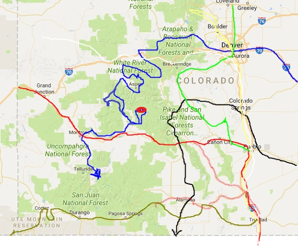 이번 여행은 파란선이며 덴버 시티로 시작하여 가운데 붉은 점에서 차량 사고가 났으며 아래의 실버톤 마을까지 행선지가 이어졌는데 전부터 다닌 길은 대략 갖가지 색깔로 표시하였으나 자세하게 그리면 이것보다 많다.