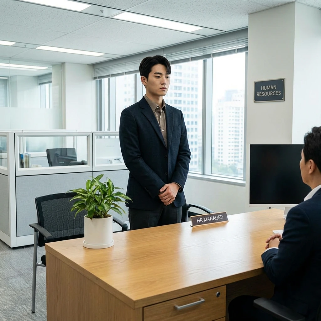젊은 남성 한 명이 인사팀 앞에 서 있었다.