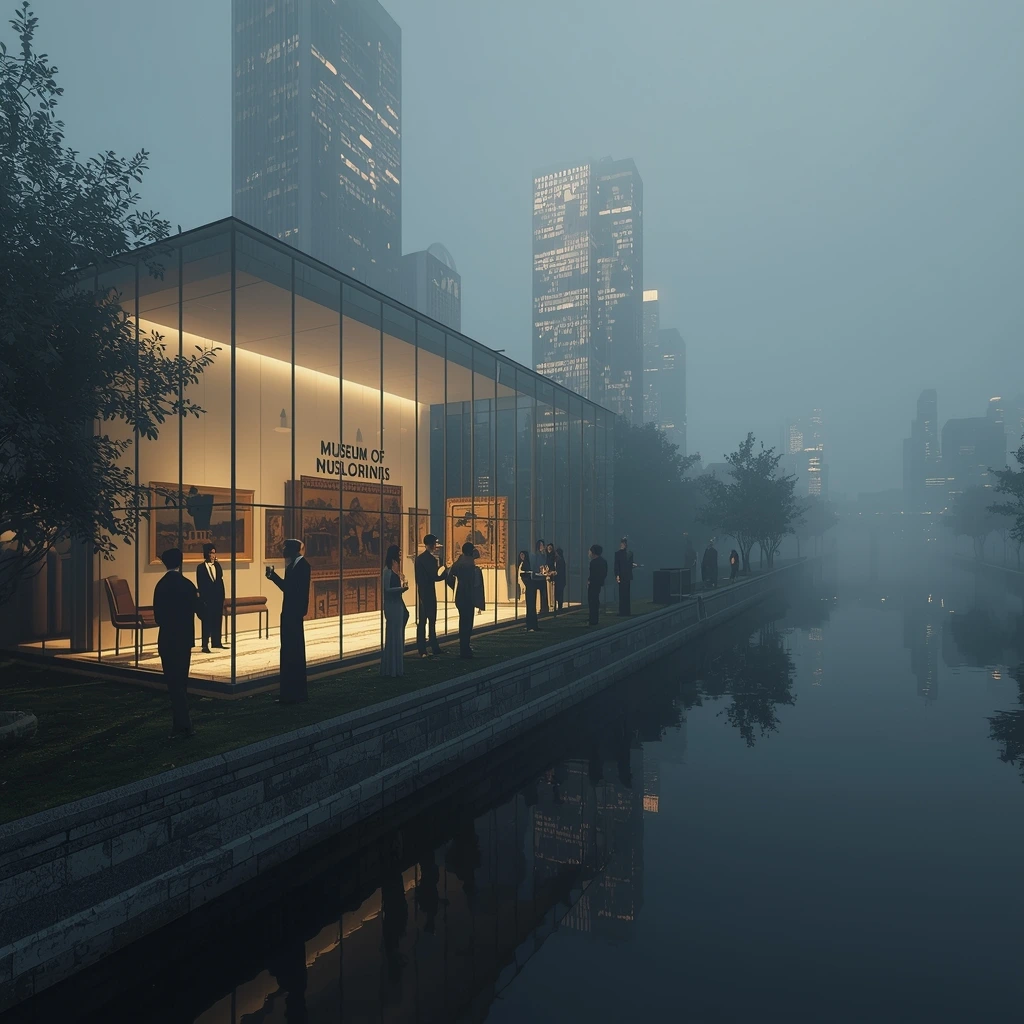 강변의 밤공기는 차갑다. 강 위에는 여전히 불빛이 떠 있고, 미술관의 유리벽에는 안쪽의 빛이 흐릿하게 남아 있다.