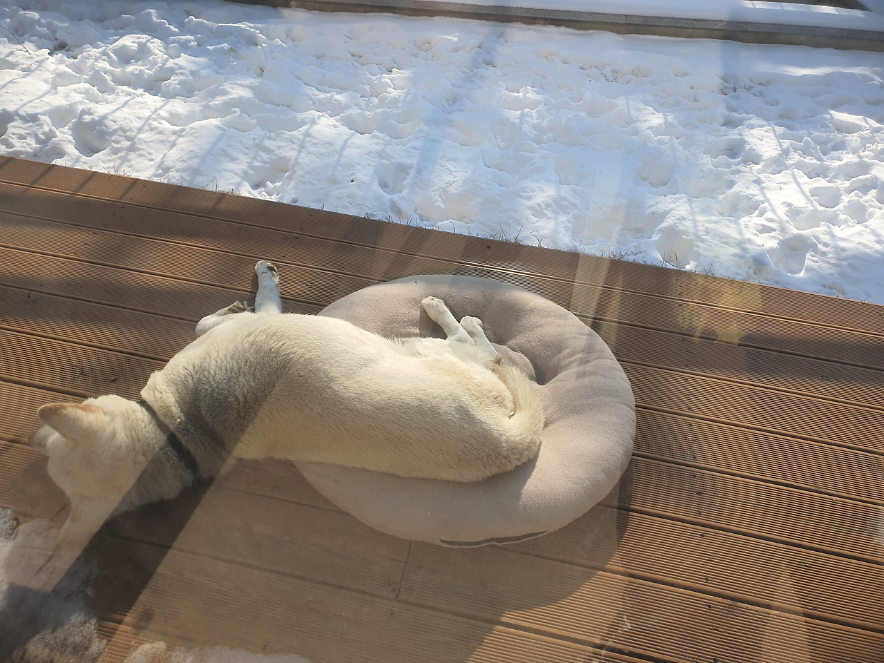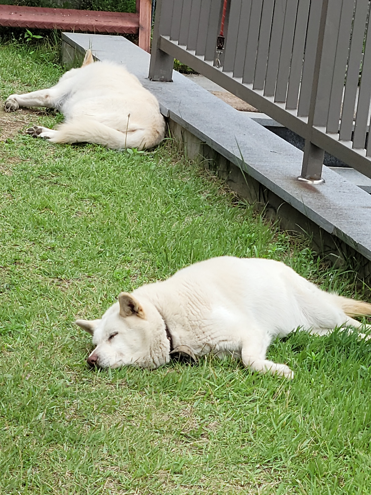 그리고 시간이 지나자 애들은 다행히 잘 적응을 해가는 것 같았고 마당이 넓으니 애들은 저렇게 풀밭에 누워 자기도 하고 예전 집의 10배도 더 되는 마당에서 뛰노니 일단은 좋았다. 하지만 마당이 넓은 만큼 나는 할 일이 더 많아졌다. 넓은 마당의 잔디를 관리해야 했는데 잔디를 깎아 줘야 하는 것은 물론 잡초는 정말 수시로 뽑지 않으면 거짓말 좀 보태서 말하면 뽑고 돌아서면 또 풀이 자라고 있었다. 그리고 걱정했던 게 지난번 집에선 좁은 곳이니 애들이 지내는 공간은 잔디가 다 죽었는데 여긴 넓어서 그런지 애들이 다닌다고 잔디가 죽지 않았고 또 다행히 애들은 잔디가 있는 곳은 파헤치지 않았다. 그래도 애들은 산책 두 번씩 나가야 했고 그래야 똥오줌을 쌌다. 마당에서 키워도 애들은 밖에 나가지 않으면 절대 배변활동을 하지 않았다. 그게 다행이기도 했고 또 귀찮기도 했다. 비가 와도(소나기 같은 비만 아니면) 눈이 와도 추워도 더워도 나가야 했다.