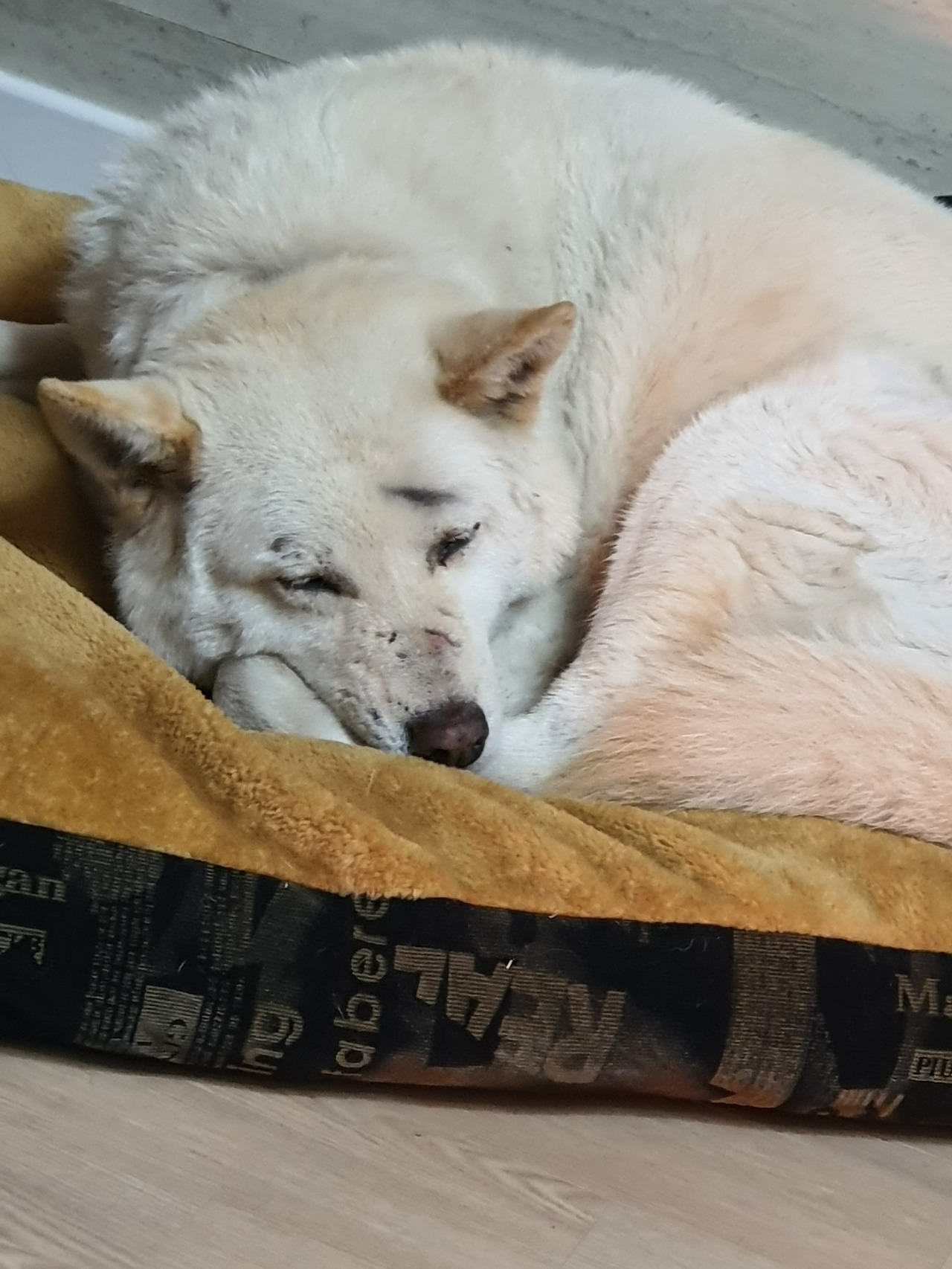 그렇게 또 세월이 가... 이 아이들 나이가 9살쯤 드니 덩치 큰 자두는 행동이 굼떠지고 예전처럼 민첩성이 떨어지고 누웠다 일어서는 것도 약간 힘을 쓰듯 일어나고 때론 다리도 절고 했다. 하지만 병원에선 일단 아직은 관절은 괜찮다고 했다. 그리고 예전엔 산책을 오래 해도 애들이 힘들어하지 않았는데 이젠 산엘 가거나 계단을 오르는 건 자두가 싫어해서 못하고 있고 다만 집뒤에 야트막한 산에도 급경사 길은 피하고 오솔길에 데려가곤 하는데 일단 계단은 자두가 싫어하고 예전 동네에선 길 건널 때 육교에서 엘리베이터를 태웠더니 다음부터는 계단은 절대 안 가고 엘리베이터 앞으로 나를 끌고 가는 것이었다. 집에서도 지하 주차장에서 계단으로 오르는 걸 싫어해서 뒷문으로 애들은 데리고 다녔다. 세월이 가니 애들이 늙는 게 티가 났다. 나보다 훨씬 세월을 빨리 먹는게 티가 났다. 슬프게도....