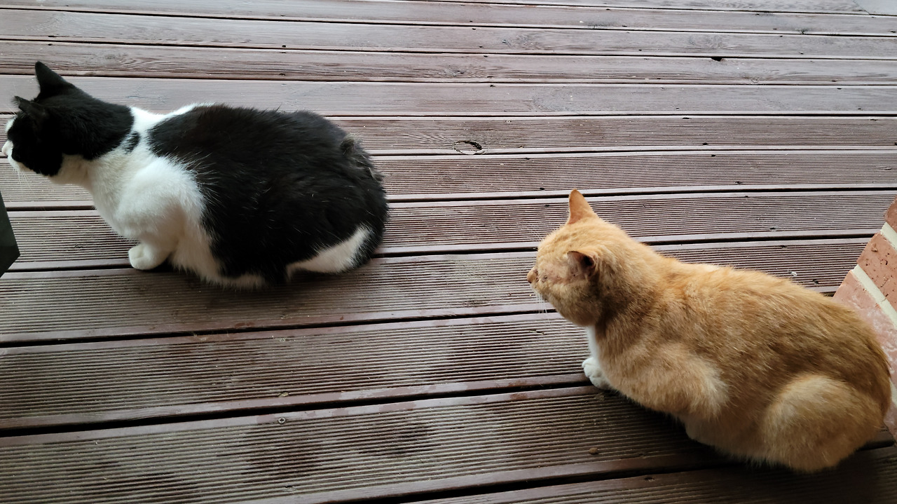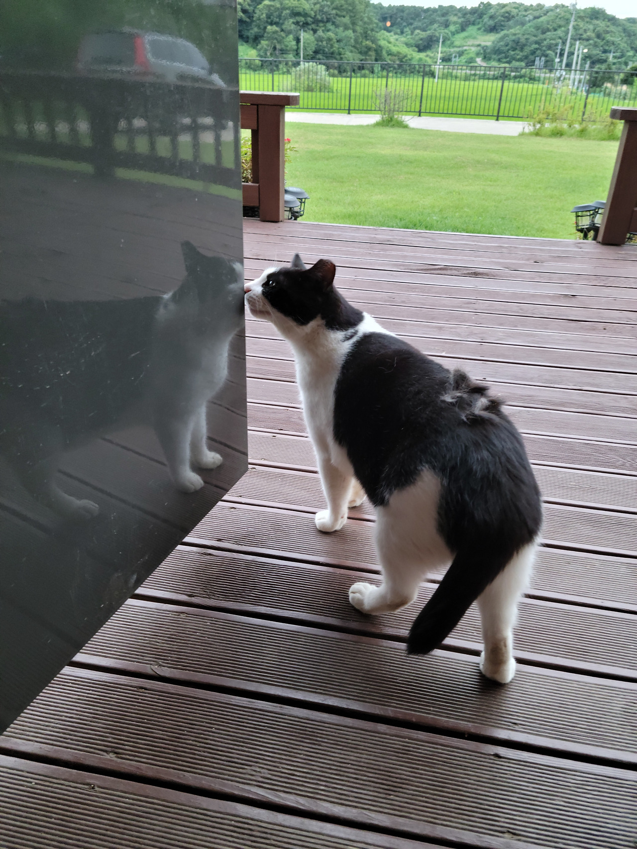 현관 밖에서 있고 턱시도는 현관 안에서 또는 밖에서 둘이 자거나 누워있곤 합니다.