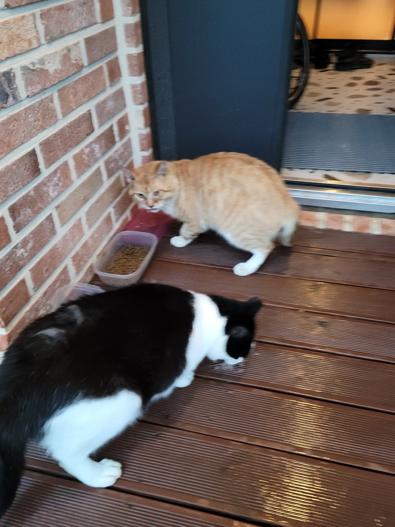 턱시도가 영역싸움에서 다른 아이들이 오는 건 막고 있어 다른 아이들것은 내가 가져다 챙겨다 줍니다. 다른 애들이 집 가까이 오긴 하지만 현관 앞까지는 못 오는데 턱시도가 이 치즈 1호에겐 허락을 하고 또 서로 코인사도 자주 나누고 하는 걸 보니 둘은