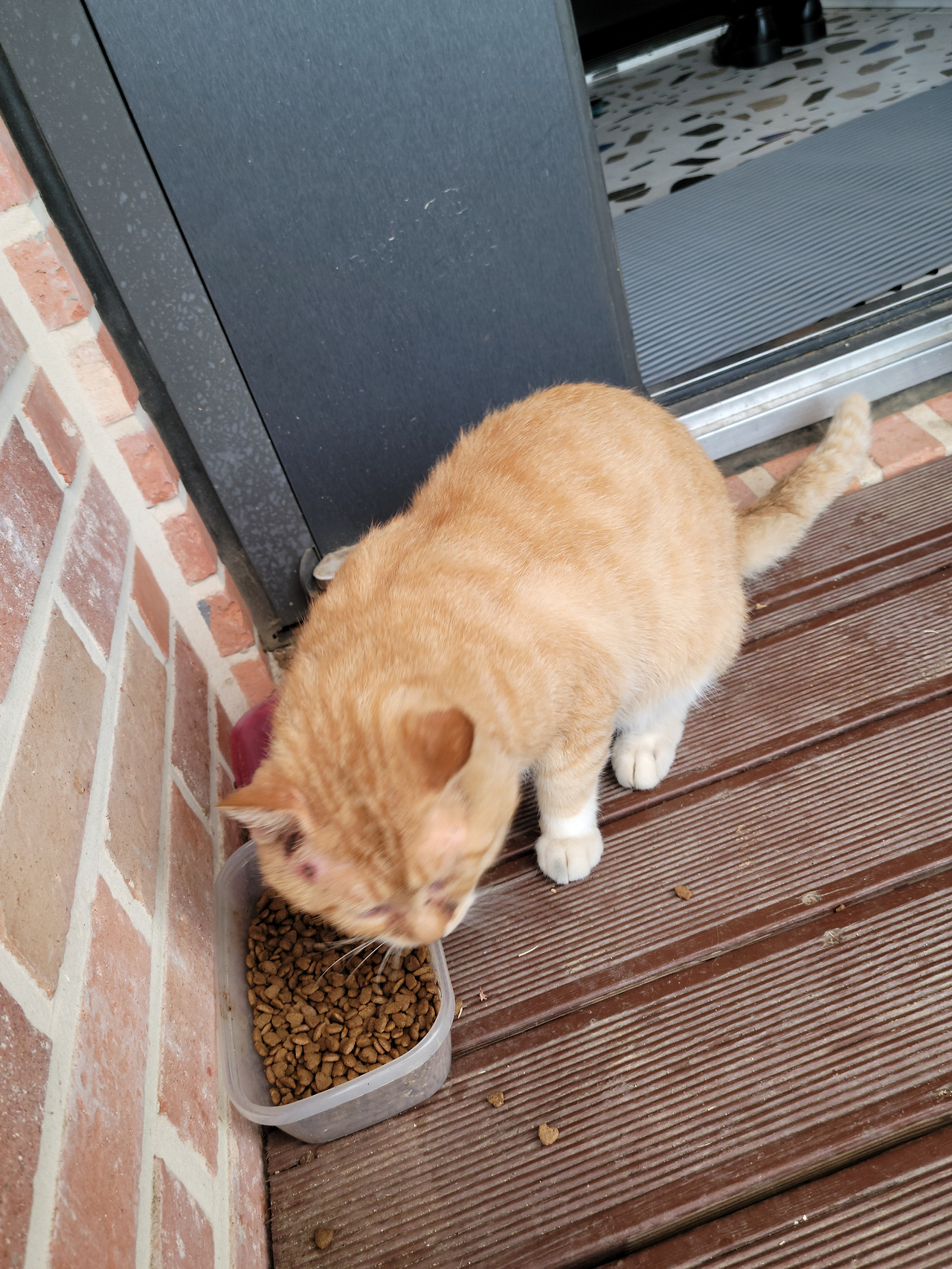 뒤지거나 비닐을 뜯어 간식을 훔쳐 먹지도 않습니다. 그런데 이 아이와 같이 나타나는 애가 생겼습니다. 영역 의지가 강한 애들이라 특히 얘는 우리 집을 자기 영역이라 여기며 다른 애들의 접근을 막고 하악질을 해대는 통에 아주 시끄러울 때가 있는데 유일하게 같이 와서 밥을 먹고 쉬고 하는 노란 애 '치즈 1호'가 나타났습니다