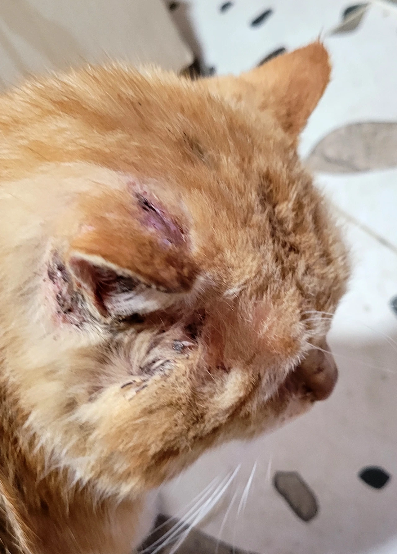 상처가 이렇게 덧나고 아물고 반복되는 상태 같습니다. 딱지도 있고 피가 엉기기도 하고 살이 드러나 있기도 하고요... 지난번 자두 약 타러 병원 간 김에