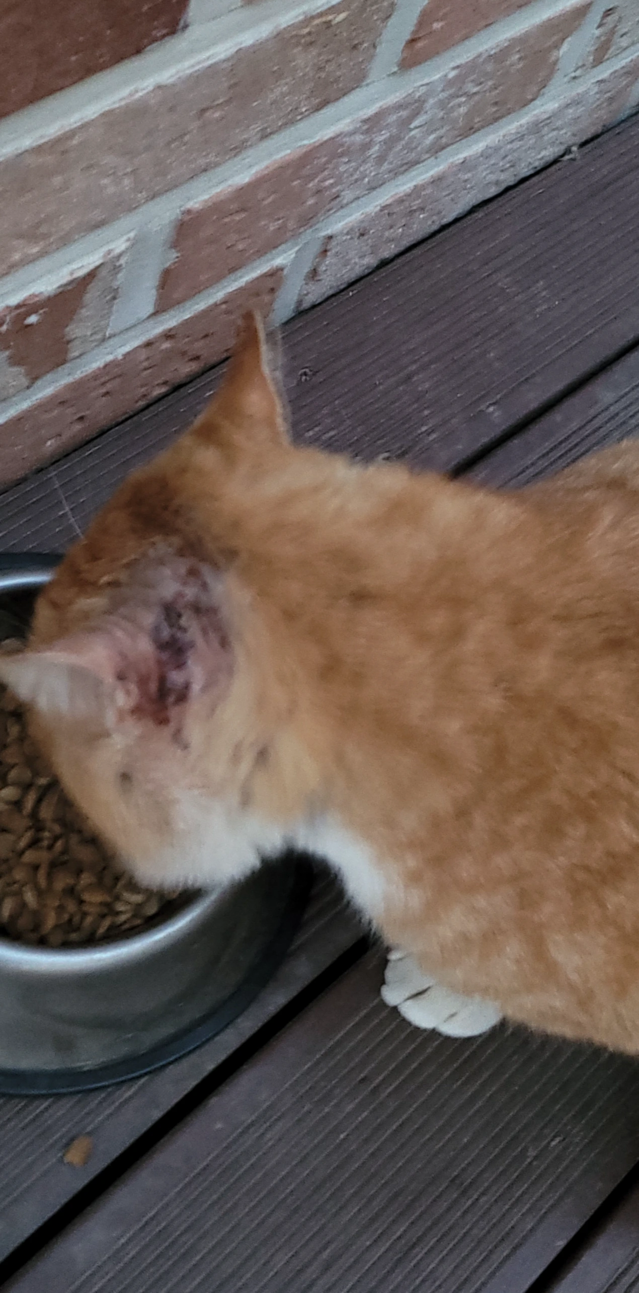 그리고 밥을 주니 밥을 먹는데... 세상에 이 애 귀뒤에 저런 상처가 있습니다. '치즈 1호'는 윗 사진처럼 오른쪽 귀에 상처가 있고 이 애는 왼쪽 귀뒤에 더 심한 상처가 있습니다. 아마도 싸우다 생긴 상처가 이렇게 덧나고 아물고 하는 것 같습니다. 야생에서 생존경쟁은 그야말로 목숨을 건 사투이니 아마 피를 보는 싸움을 하거나 다른 천적을 만나면 죽자고 싸워야겠지요... 이 애들의 삶은 이렇다는 걸 다시 한번 확인하며 가슴이 짠해옵니다. 이렇게 라도 살아 있고 나를 보자 쫓아와 밥을 먹는 '치즈 2호'가 대견하기도 하고 또 가슴이 아프기도 합니다. 힘겹게 난 겨울, 따스한 봄인데 애들은 이렇게 되고...