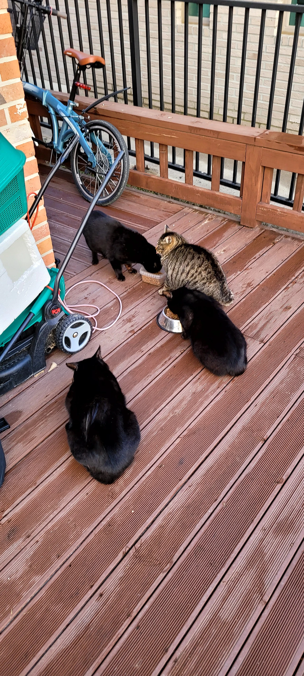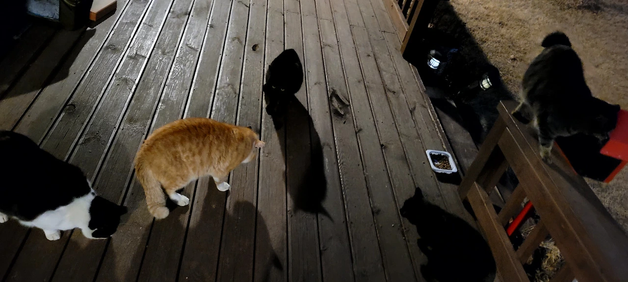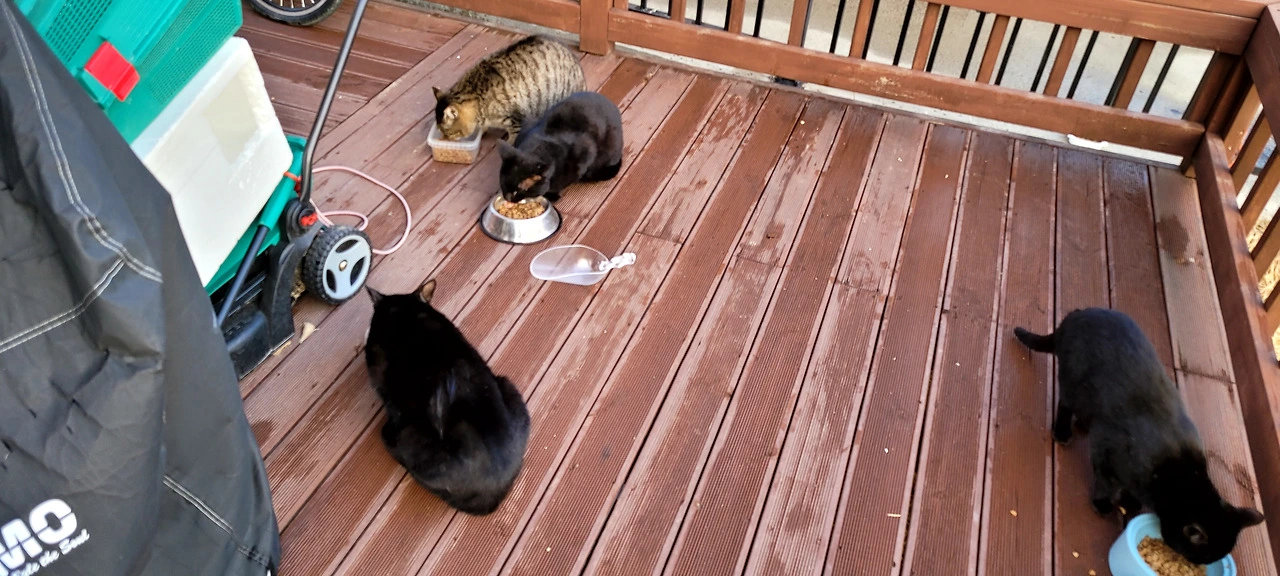우선 검정냥이들은 우리 집 데크 위에 3마리... 옆집 데크 위에 1마리... 그리고 또 집 데크 중앙엔 블랙이 아닌 애들이 3마리... 아마 이날 냥이들 반상회가 열렸나 봅니다. 일단 한꺼번에 4마리나 온 블랙이 들을 보자면...
