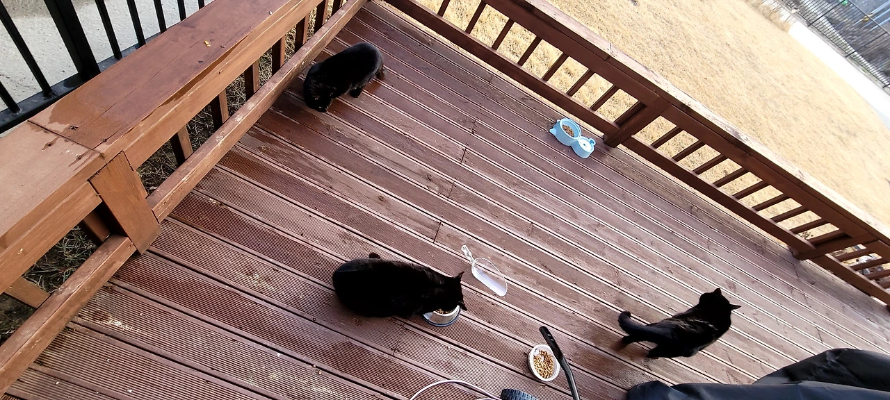 우리 집으로 못 오고 옆집 데크 위에서 우리 집을 보고 있는 애는 우주 최강 겁쟁이 '블랙이 0호'이고(사진에 없음)나 머지 애들은 기존의 '블랙이 2호, 3호'와 얼마 전부터 나타나 집안으로 들어오려는' 블랙이 4'호(일단 그렇게 붙였습니다) 이렇게 4마리가 와 있는데... 신기한 건 다리를 저는 '블랙이 2호'가 어떤 연유인지 데크 위로 왔습니다. 아마도 다리가 아프니 점프로 자두네 집 지붕 위로 오르는 게 힘드니 이리로 온 것 같습니다만... 다른 애들 틈에서 애가 견뎌 날까 걱정이었는데 나름 하악질을 하며 다른 애들 틈에서 밥을 먹습니다.
