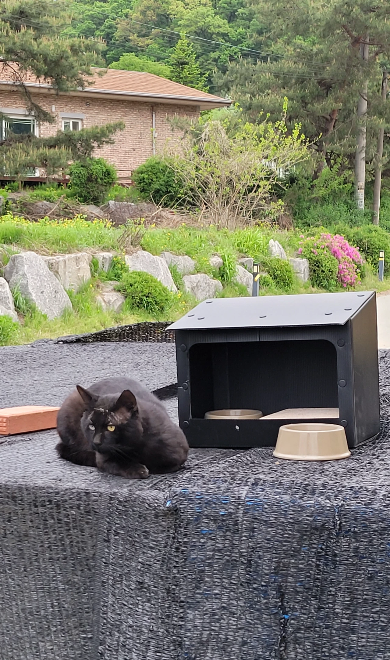 안에서 잠을 잘 수 없으니 안 오는 경우가 많고 밥때 오면 밥은 먹는 둥 마는 둥 하다 현관 앞에 있다가 돌아갑니다. 안타깝지만 그렇게 하고 있습니다.