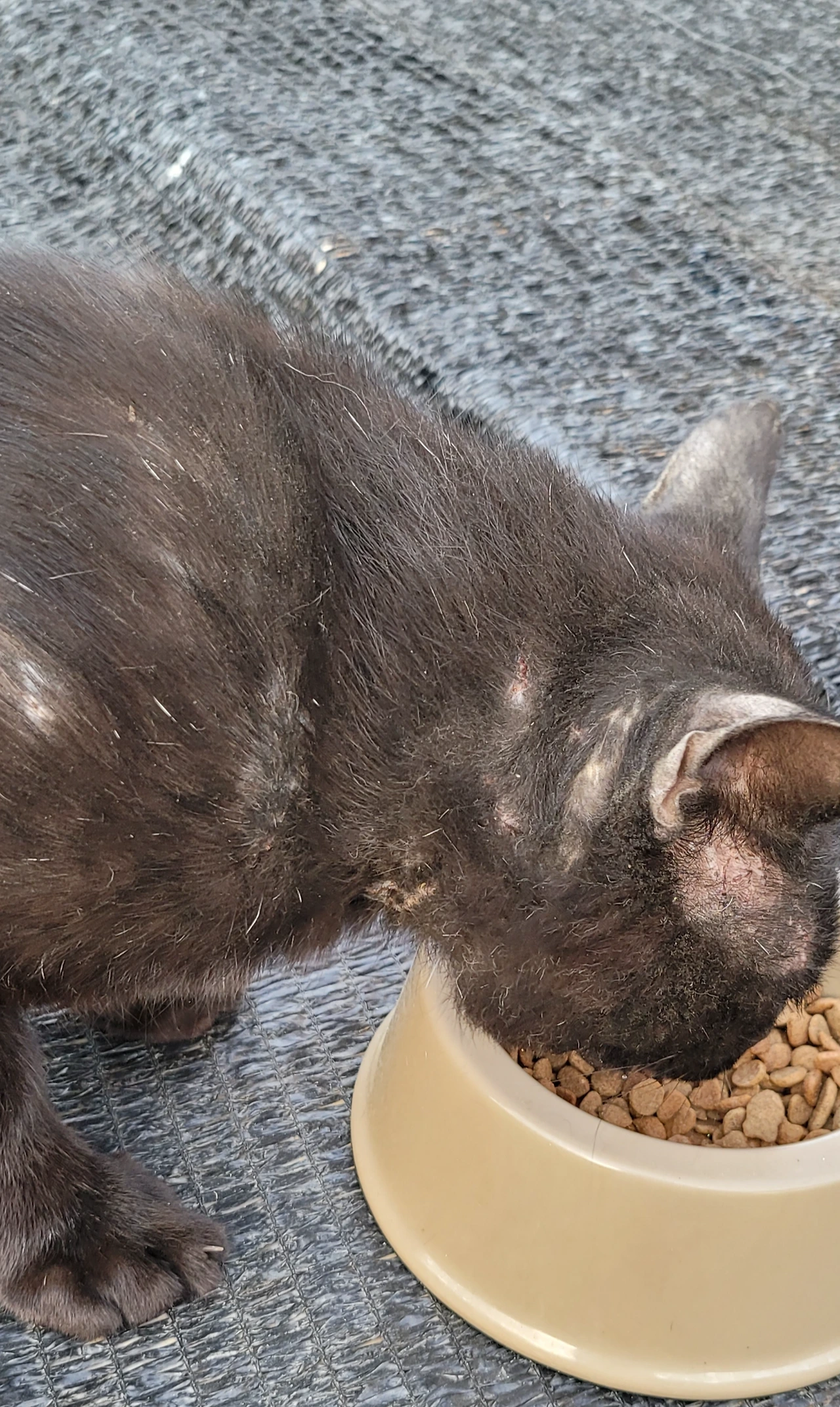 사나워져서 다른 애들과 먹이 경쟁도 하고 그럽니다. 다른 애들과 싸우려 하고 먹이 경쟁에서 밀리지 않겠다는 듯 악착을 떠는 것 같아 안타깝습니다. 왼쪽과 가운데 사진은 얼굴과 목부위에 상처가 날로 늘어 너무나 흉측합니다. 동네 조폭이 된 건지 날로 상처가 늘고 다리도 절고... 에고.....