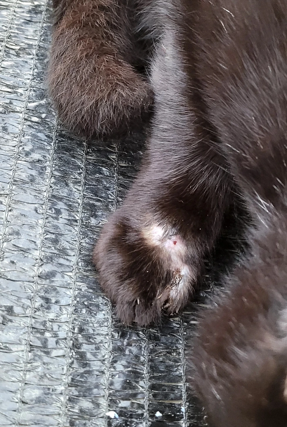 '호피'에 밀려 이 영역에서 쫓겨나고 말았습니다. 그렇게 안 오더니 어느 날엔 데크 오른쪽 예전 '치즈 2호'의 영역으로 와서 밥을 먹기도 했습니다. 그렇게 뜸하게 오다 말 다를 하던 어느 날 '블랙이 2호'는 다리를 절며 원래 자리인 지붕 위로 나타났는데 오른쪽 앞발을 들고 다녀도 그때는 발견 못하다 2주쯤 지나니 발에 이런 상처가 있었습니다.