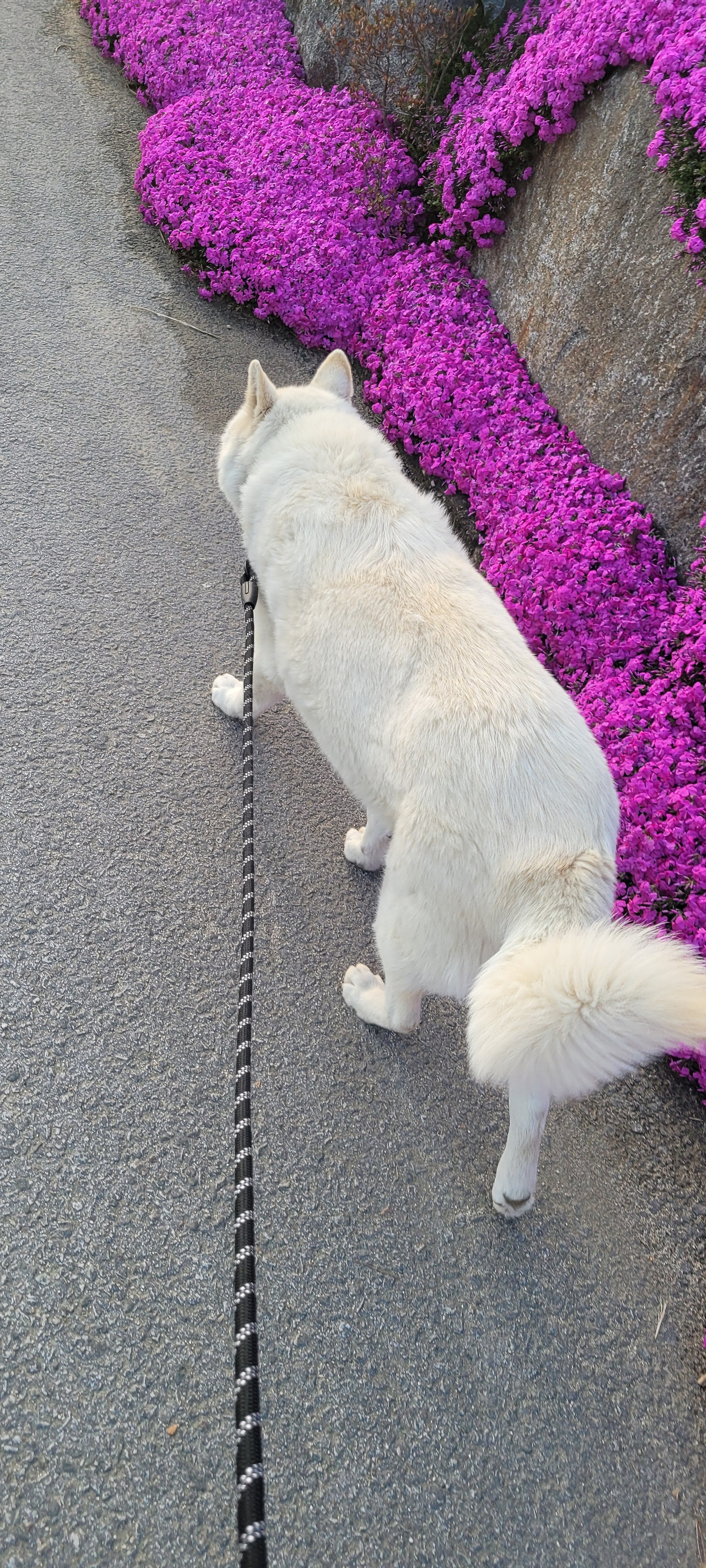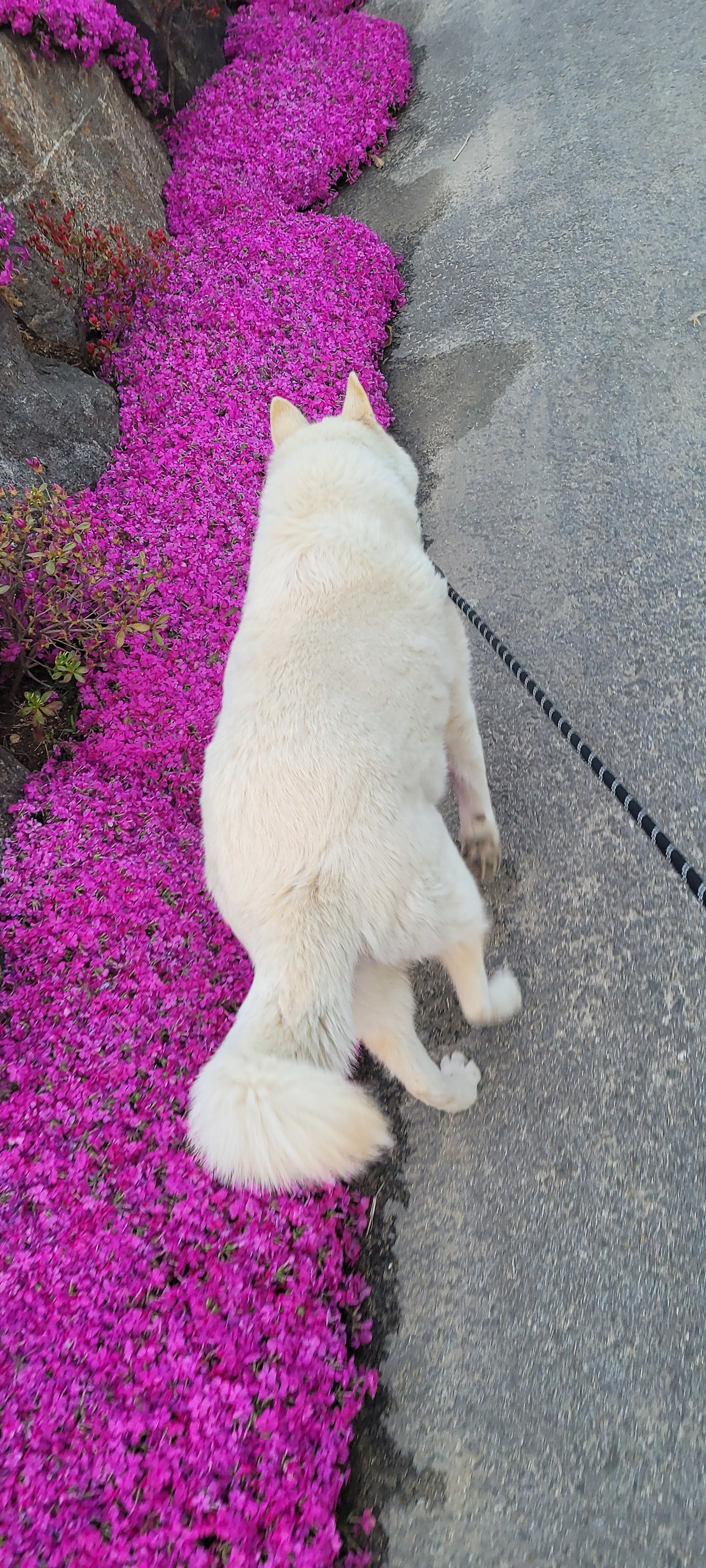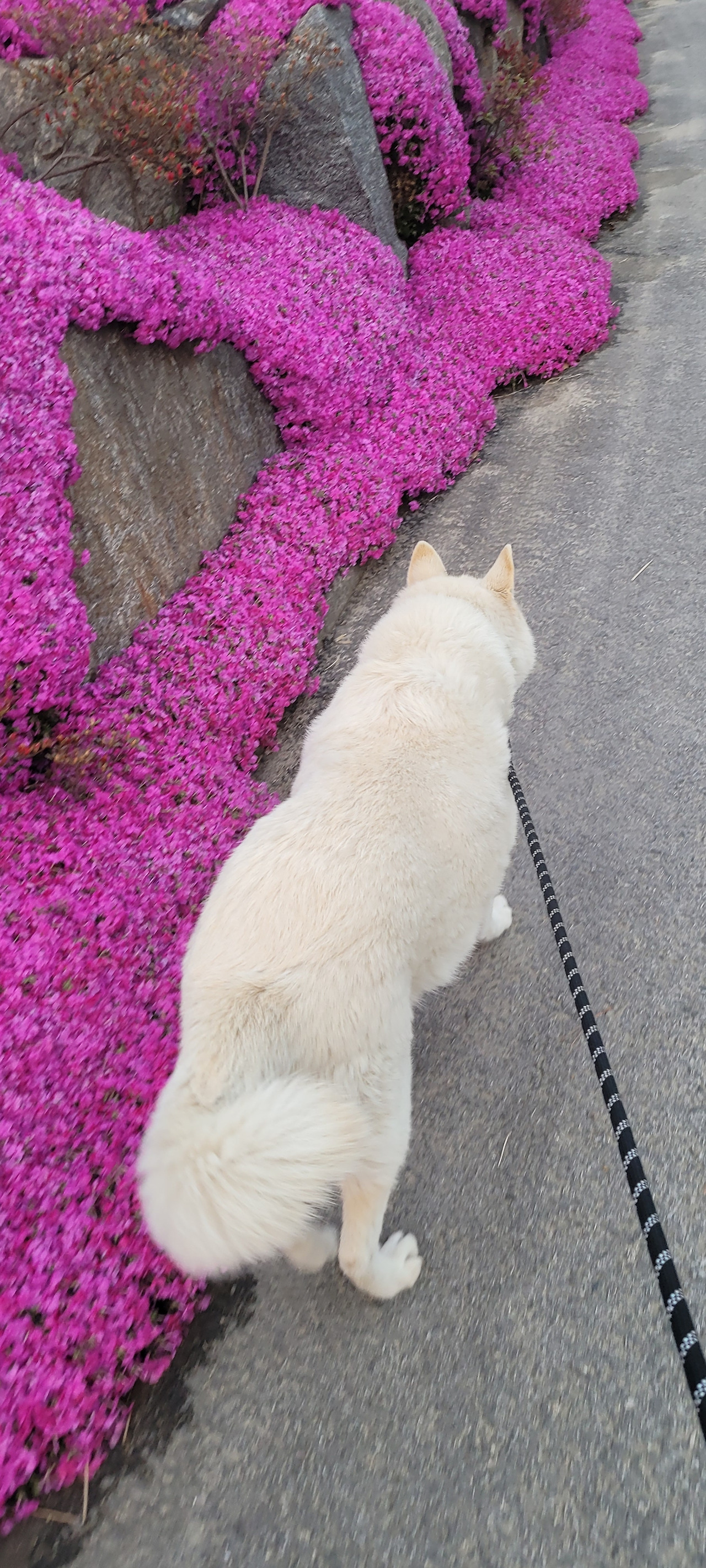 얘가 이 길을 얼마나 좋아하는지... 꼭 이길로 가려합니다. 꽃 잔디가 만개 한 우리 동네 길...