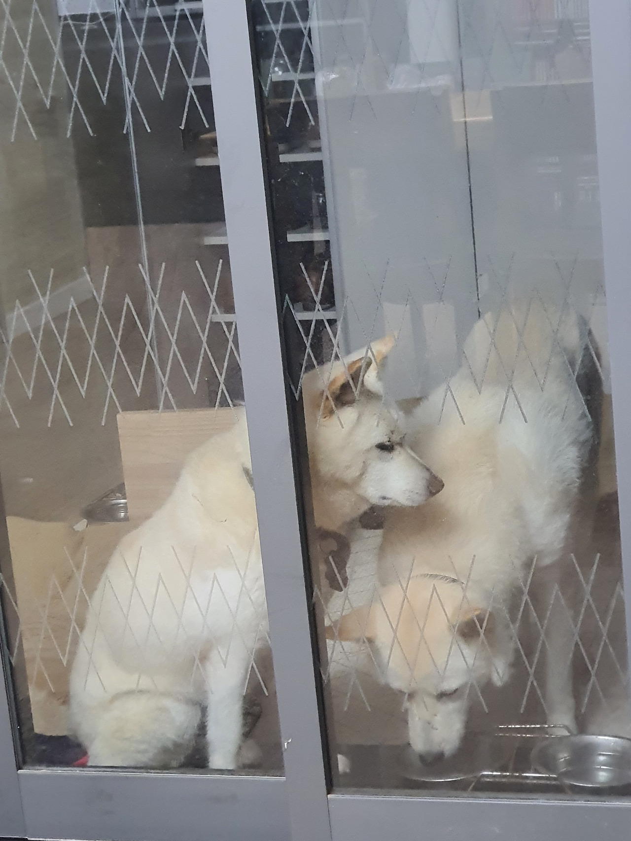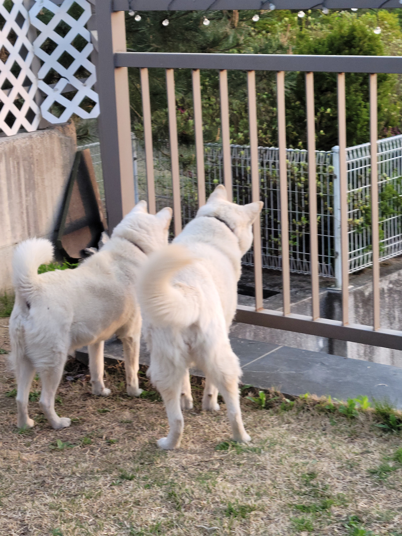 마당이 너른 집으로 와서 애들이 뛰놀기에는 좋았으나 데크에 있는 집에는 들어가려 하지 않아 애들은 현관 안쪽 전실에서 생활하게 되었다. 둘이 쓰긴 좀 좁긴 하나(사이좋은 애들이라면 붙어 자면 되지만... 얘네들은 절대 붙어 있지 않는다) 비를 피하려면 어쩔 수없이 현관 안으로 들어오게 하는 수밖에 없었다. 모르겠다. 그냥 밖에 두었다면 집에 들어가지 않았을까? 생각도 해보지만 어쨌든 그렇게 되었다. 사실 커다란 텐트를 치고 그 안에 개 집 두 개를 두었지만 그 텐트 안에 들어갈 생각도 안 해서 그건 그냥 돈만 버린 꼴이 되었다. 그 때문에 현관문은 늘 열어 놓고 있어야 했고 다행히 이 집은 동네 제일 끝 집에다 지대가 높고 대문을 잠그고 게다가 개들이 두 마리나 마당에 풀어놔져 있는데 누가 들어올까... 하고 그냥 현관문을 열고 살았다. 물론 다행히 누가 들어온다거나 하는 일은 없었다. 다만 겨울엔 애들이 자는 밤엔 현관문은 닫고 아침에 열어 놓고 내보내고 하는 생활도 했었고 애들도 자기네 집은 현관 안쪽이라 생각하는 것 같았다. 그럼에도 애들은 천둥번개가 치면 중문을 긁어 안으로 들여보내달라고 애걸을 했다.