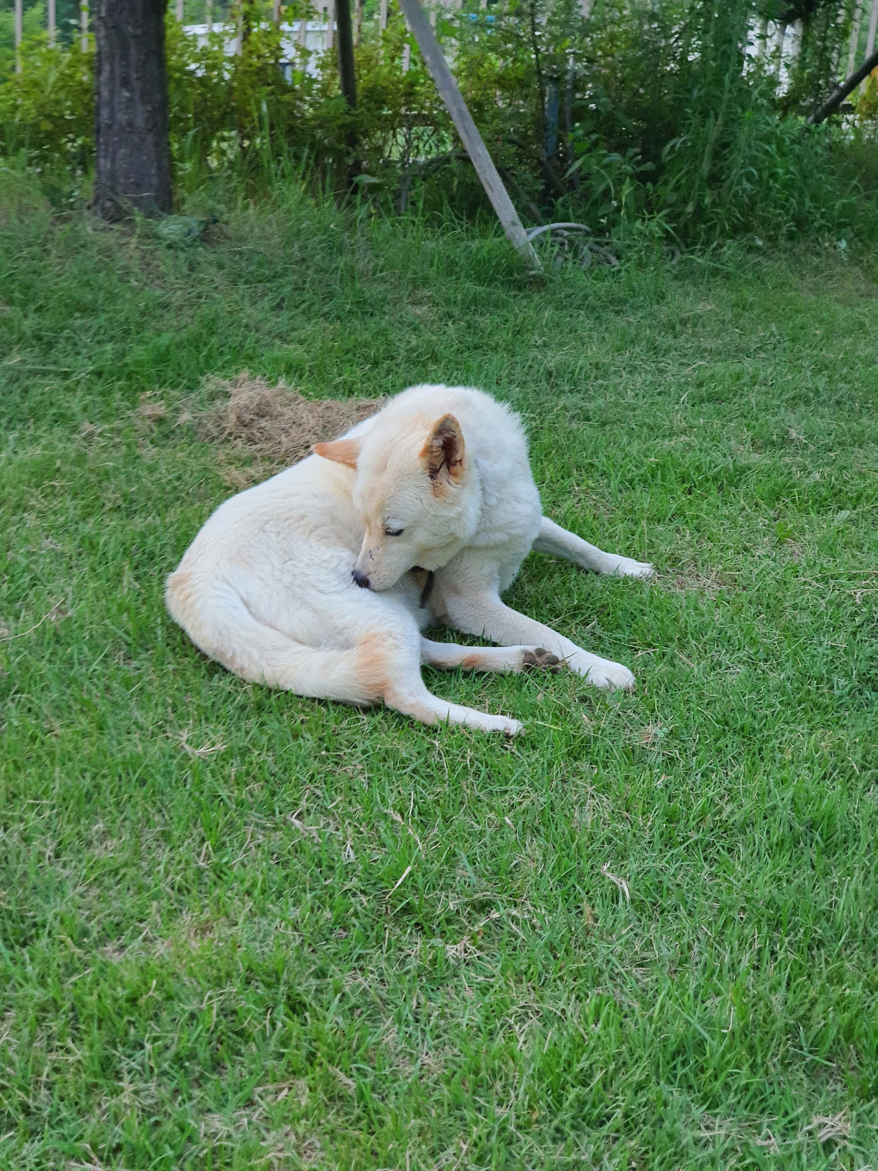 자두는 잔디에 최적화된 아이처럼 잔디에서 뒹굴고 자고 쉬고 놀고.... 모든 걸 그냥 잔디가 자기 집인 양 마당에서 잘 지냈다. 물론 비가 오는 날엔 현관으로 들어오지만 보통의 낮엔 그냥 마당에서 살았다. 벌레들이 자두를 성가시게 하기도 하겠지만 일단 진드기 약을 정기적으로 발라주고 기생충 약도 꼬박꼬박 먹였다. 다행히 병원 진찰에선 두 애들 다 괜찮다고 했고 9살이 되니 대형견인 자두는 노화가 진행되는 듯했다. 산책 시 계단은 안 가려 하고 심한 비탈길도 피하려 했다. 지하주차장으로 가는 계단으로는 산책을 나가지 않고 꼭 뒷문을 통해 나가려 했다. 그에 비해 살구는 아직은 몸도 날렵하고 잘 뛰어다니긴 했다. 하지만 대개 7살이 지나면 노령견이라 하니 주의는 요해야 한다고 했다. 하지만 나는 그냥 머릿속으로만 생각했고 철저한 관리는 하지 않았다.