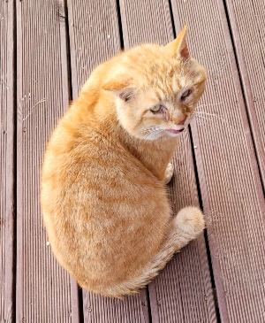 좀 특이한 애라 말씀드렸는데 이 애는 요즘도 역시 밥에는 별로 관심을 두지 않고 데크 한편에 엎드려 가만히 애들의 동태를 살피고 애들이 밥을 어느 정도 먹으면 그때 나서서 빈 밥그릇으로 갑니다. 이타심이 강한 건지 일단 밥 경쟁에는 뛰어들지 않습니다. 그리고 다행히 요즘 꼬리 상처는 나아서 새로운 털이 덮고 있습니다.