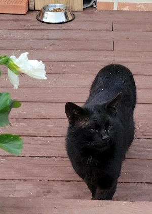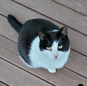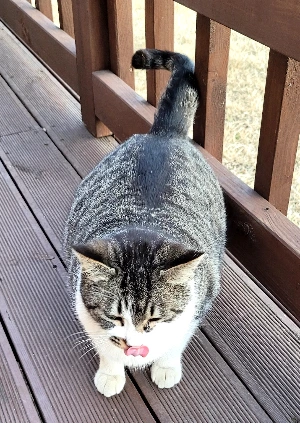 가장 오래된 애로 22년 12월에 와서 우리 집 데크에 자릴 잡고 살기 시작한 터줏대감이며 2년이 되어 갑니다. 이듬해 봄에 온 '치즈 1호'와 친구가 되더니 그다음부터는 둘이 집 근처에 오는 애, 특히 데크로 올라오는 애들은 공동으로 물리치며 이곳을 독점하며 최고의 자리에 있었습니다. 그런데 요즘 '턱시도'는 마음씨가 좋아진 건지 힘이 없어진 건지 여러 아이들이 데크에 올라와도 그냥 놔둡니다. 하도 많은 애들이 오니 포기한 건지... 밥도 제일 나중에 먹습니다. 그런데 이상하게도 유독 자두네 집 지붕 위로 오다 데크로 오기도 하는 '블랙이 2호'에게만은 하악질과 경계를 합니다. 그리고 겨울에 현관으로 와서 잠을 자던 '블랙이 4호'는 이 애에게 공격적 성향을 보이기도 했습니다. 이 '턱시도'는 집안에는 잘 안 들어오면서도 나만 보면 졸졸 따라다니고 심지어 애교도 부릴 줄 아는 개냥이가 되었습니다.