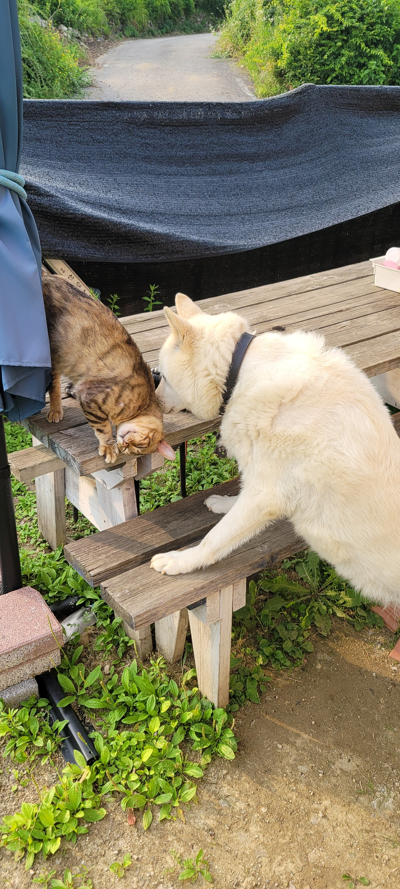 와 있는 겁니다. '자두'는 좋아 어쩔 줄 모르고 핥고 난리가 난 겁니다. '호피'도 그걸 즐기듯 아주 좋아 죽겠다는 표정입니다. 아무튼 정말 놀라서 '호피'야 하고 부르니 냐옹거리며 내게도 아는 체를 합니다.