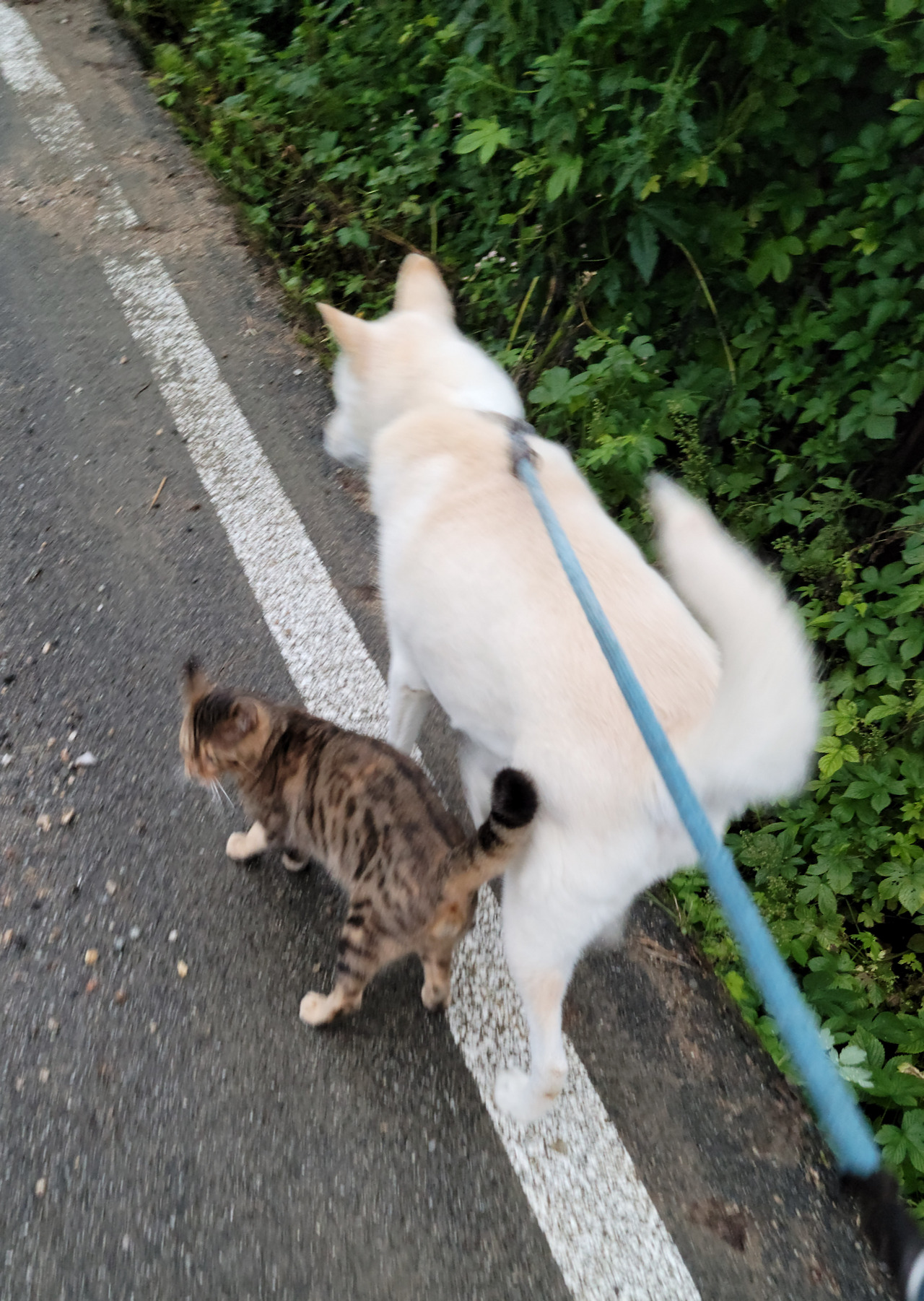 '자두'는 이 조그만 아이에게 공격성보다 관심을 보이기 시작하더니 심지어는 보호해 주다가 둘이 절친이 되어 같이 살기 시작했습니다. 게다가 이 둘은 산책도 같이 다니는 등 동네 스타가 되기도 했습니다.