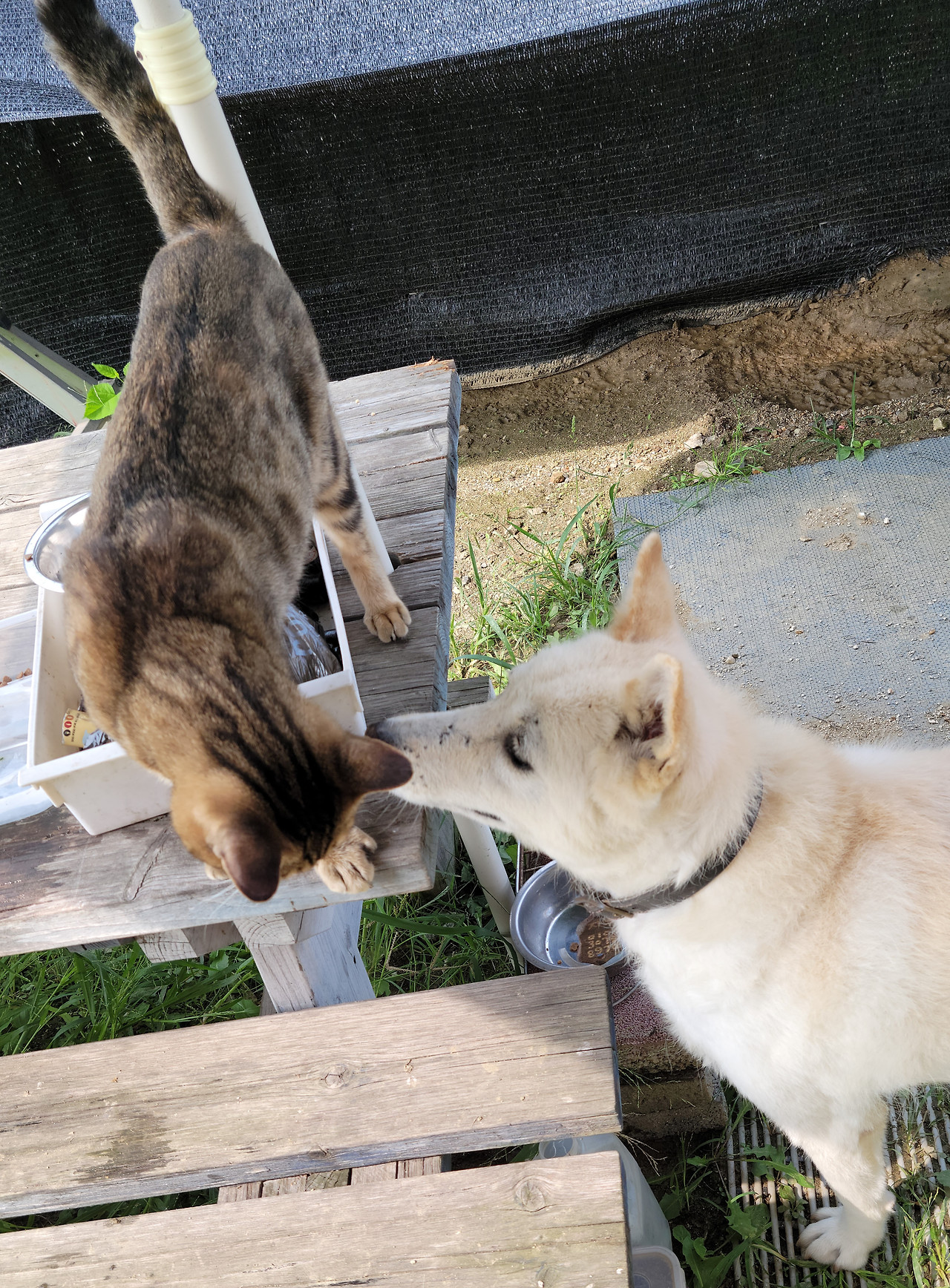 지난해 여름 자두와 같이 11년을 살았던 '살구'가 세상을 떠나자 시름에 빠진 자두는 우울증인지 밥도 안 먹고 잠만 자는 등 행동변화가 오기 시작했는데 이때 '자두' 우리로 '호피'가 들어온 겁니다. 그 시초는 아마도 데크에서 밥을 먹다 다른 아이들에게 쫓겨 '자두'네 우리로 들어온 게 아닐까 합니다. 그때 '자두'가 이 애를 보호해 주기 시작했는데.... 신기하게도 상극이라 여겼던 길냥이가 '자두' 우리에 들어오자 놀랬지만 의외로