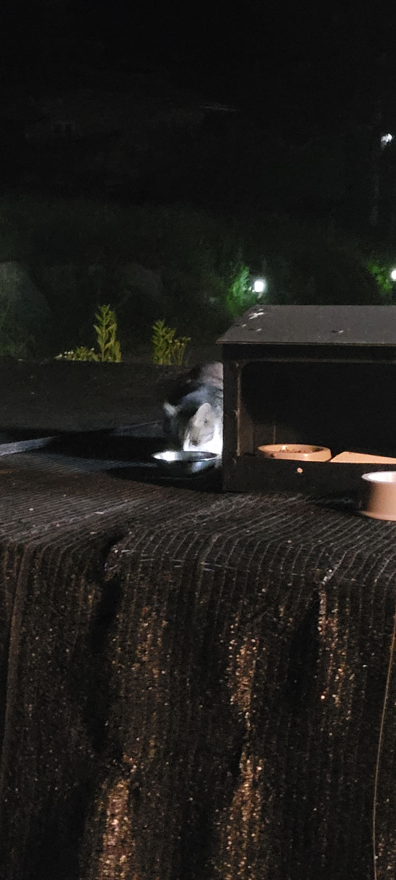 떠돌이 같아 보입니다. 우리 집에 오는 애들이 대충 우리 집에서도 영역을 나눠서 밥을 먹고 데크 위에서 먹는 애들은 서로 얼굴을 알거나 한때는 '고등어'가 허락한(?) 애들은 데크 위에서 밥을 먹는데 이 아이는 밤에만 와서 그것도 '자두'네 집 지붕 위에서 밥을 먹는 걸 보면 우리 동네 아이는 아닌 것 같아 보입니다.