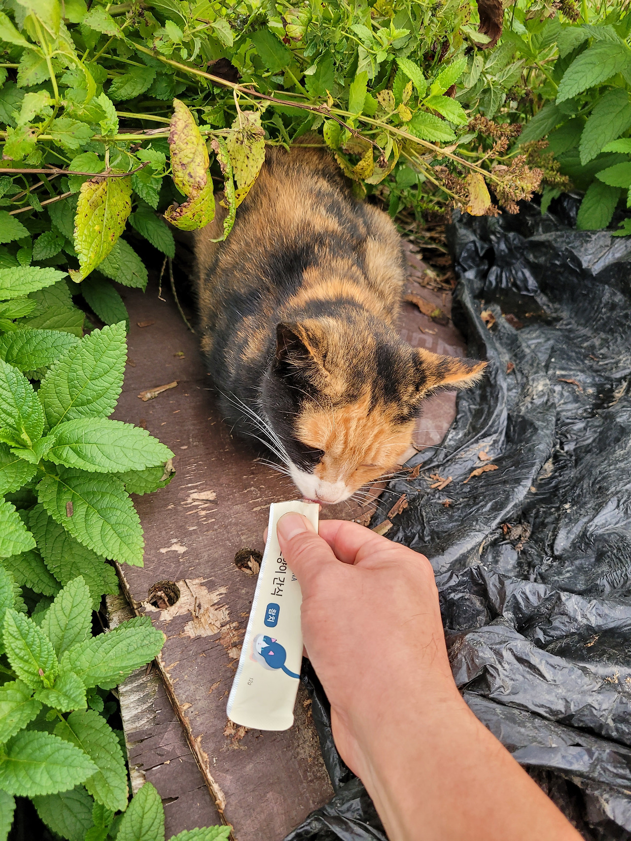 '삼순이'가 남기고 간 새끼 3마리 중 '하얀 치즈'는 내 눈에 띄지 않게 살아 발견이 잘 안 됩니다. 그리고 '까망이'와 '노란 치즈'는 매일 나를 따라다니고 냐옹거리며 말을 겁니다. 아마도 먹을걸, 간식을 달라고 하는 거 같습니다. 하지만 이 애들에게 간식을 주지 않고 있습니다. 어차피 야생에서 살려면 간식은 못 먹고살고 또 버릇을 들이지 않기 위해서 그렇습니다. 가슴이 좀 아프지만 이 애들에겐 그래야 합니다.