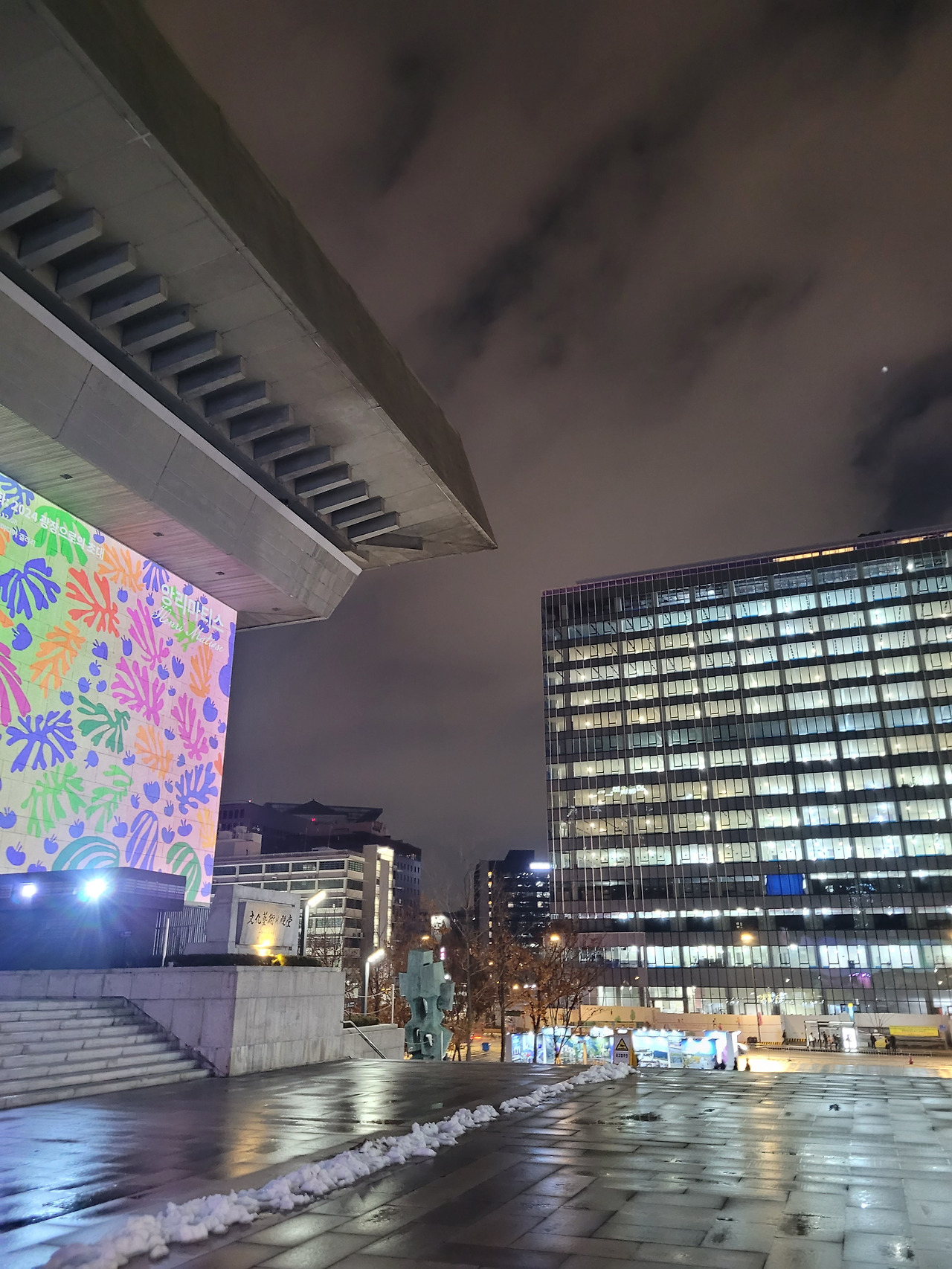 진눈깨비가 날리는 저녁 세종문화회관은 조경 불빛과 흐린 하늘이 묘하게 어울렸다.