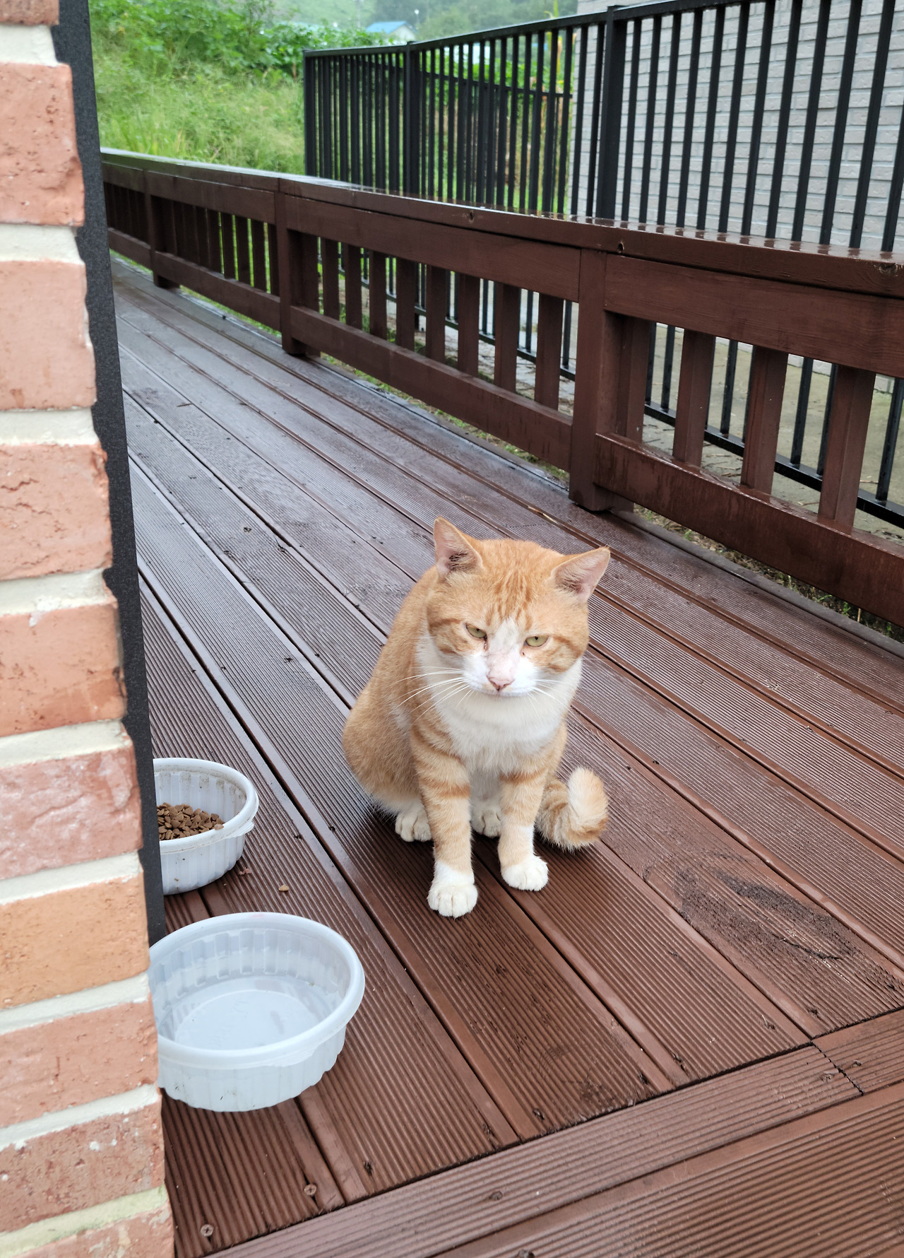 밥그릇까지만 와서 밥을 먹기 때문입니다. 가끔은 내가 통조림을 가져가면 턱시도나 치즈 1호가 하악질을 하며 치즈 2호에게 경계를 하기도 하는데 일단 이 아이는 절대 더 이상 이쪽으로 오지는 않아 영역의식이 강한 얘네들 사이에선 더 이상 큰 부딪힘은 없는 것 같습니다. 다행입니다. 다만 얘는 그러다 보니 다른 애들처럼 거리를 좁히지 않아 간식은 잘 못 먹고 있습니다. 그게 안쓰럽기도 하지만 다행이기도 하고요... 간식맛까지 들이면...