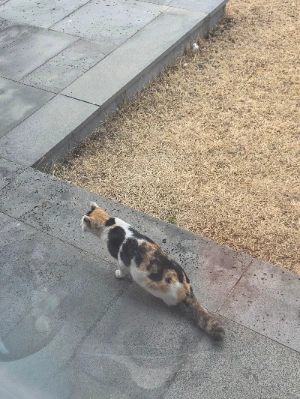 며칠 전 마당에 나타난 새로운 아이입니다. 이 애는 조심조심 현관 쪽으로 다가가는걸 거실 통창에서 발견했습니다. 이 애는 현관 쪽에 아마도 자두가 있으니 살금살금 다가가는 것으로 보입니다. 이 애는 우리 집 뒤쪽 숨집에 밥을 놓아두는 곳, 그쪽에서 나와서 거실 앞을 질러 현관 쪽으로 다가가는 것 같습니다. 아마도 숨집에 밥이 다 떨어져 자두네 집에 둔 밥이나 마당 테이블 밑에 둔 고양이 밥을 먹으러 오는 것 같습니다. 어쨌든 우리 집에 오는 아이들이 내가 모르게 다른 아이가 또 있었다는 걸 알았습니다. 이 아이는 까망이보다는 덩치가 작아 보입니다.