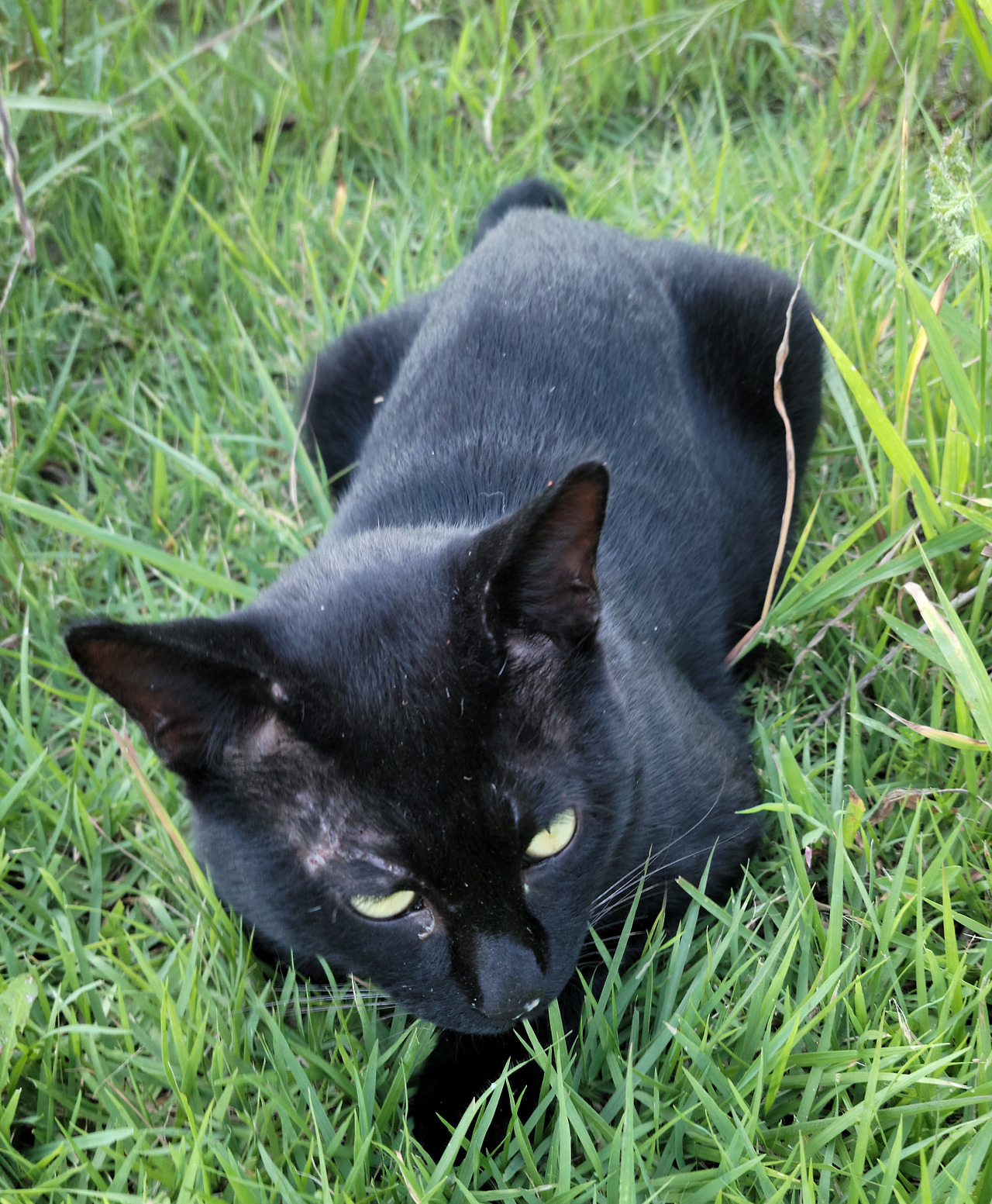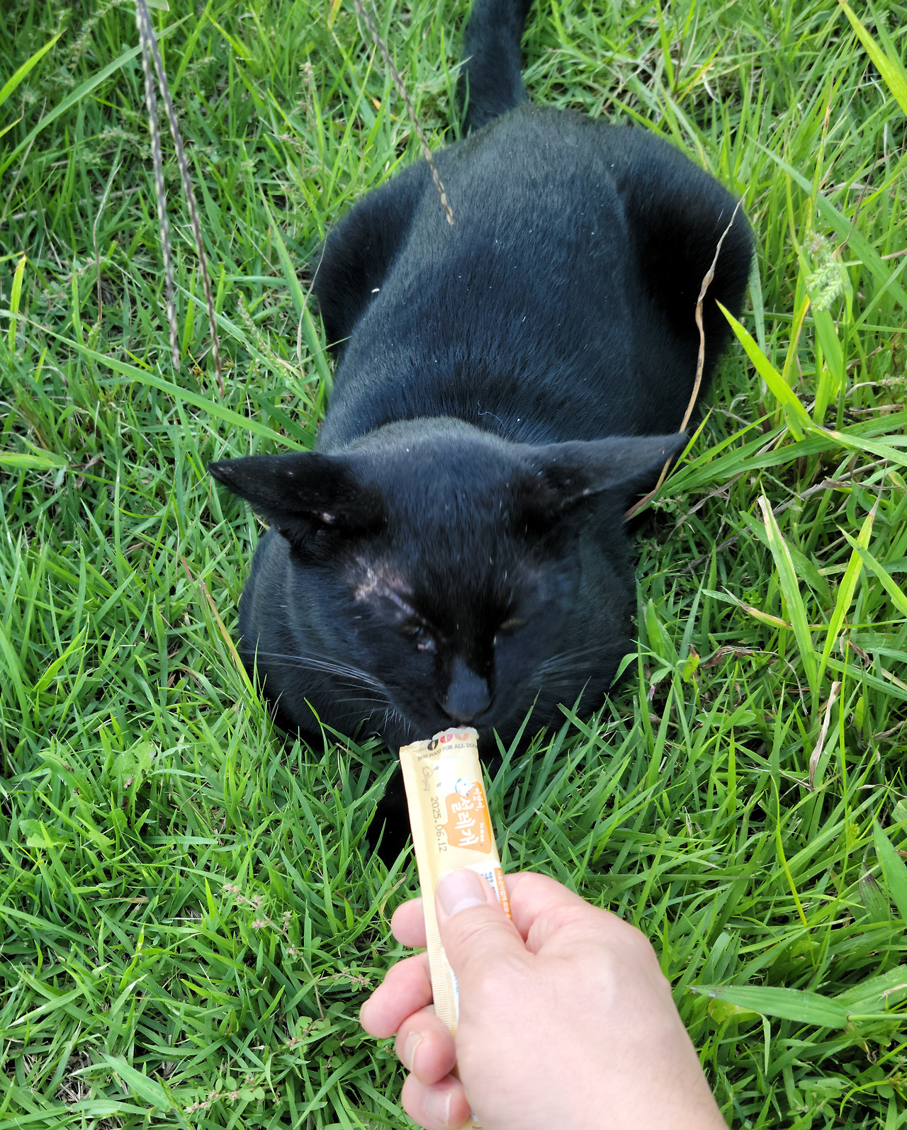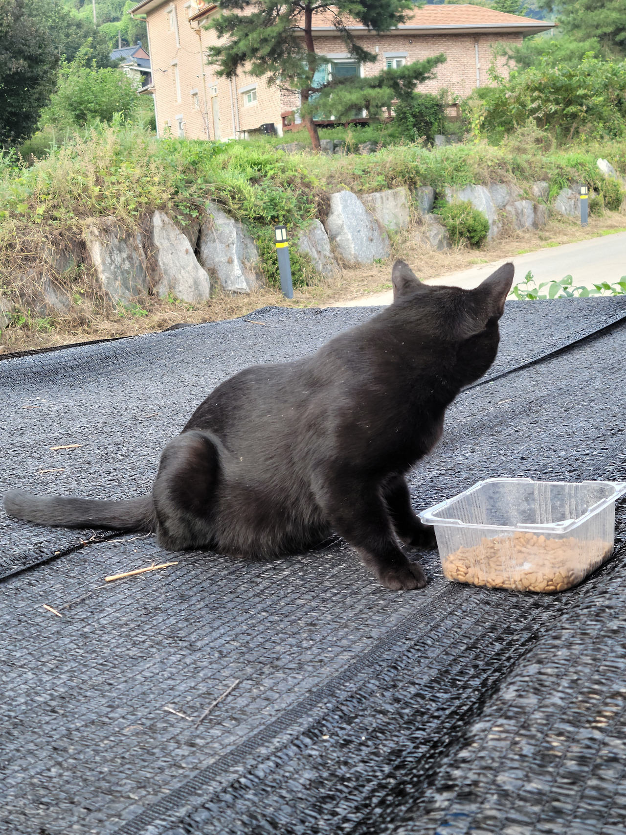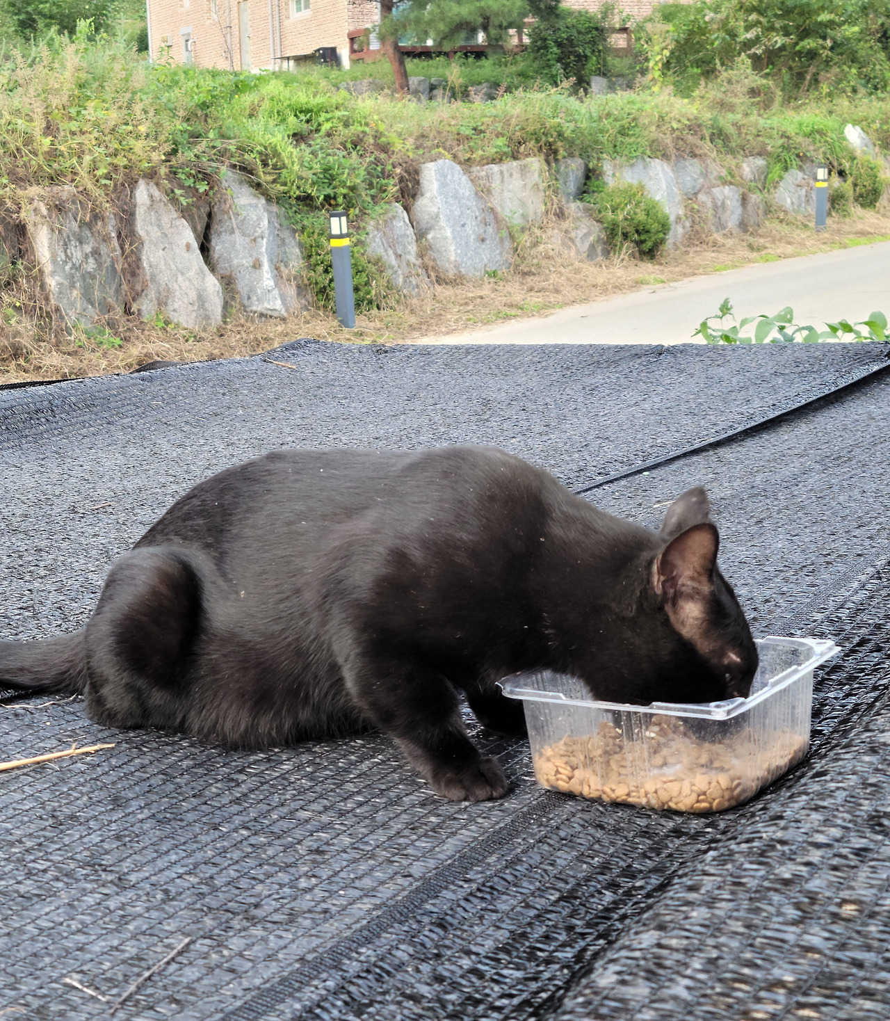 어쩌다 한 번씩 오는 블랙이, 턱시도 때문에 데크 위로는 못 오고 마당 언저리를 배회하며 눈치를 봅니다. 내가 밥이나 간식을 배달해 주면 거기서 먹곤 하는데 그것도 턱시도의 눈치를 보며 먹습니다. 우리 집에서 자기 영역을 갖지 못하고 마당에서 배회만 하는 좀 불쌍한 블랙이입니다. 그래도 나를 경계하지 않고 간식도 먹고 밥을 가져가면 피하지 않고 그 자리에서 먹습니다. 소심하고 겁이 많아 현관 근처에는 못 옵니다