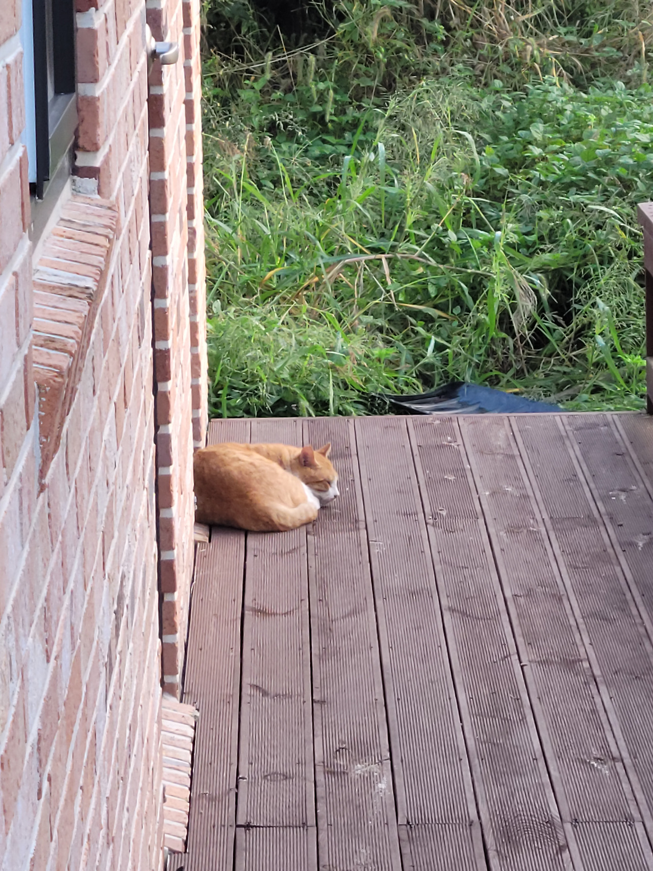 그러나 이 집이 아무래도 임시로 만든 집이라 인터넷에서 길냥이용 집을 주문해서 그걸 조립해서 그 자리에 뒀는데 웬걸~ 거긴 안 들어가고 그냥 데크에서 자는 겁니다. 밤엔 추운데...