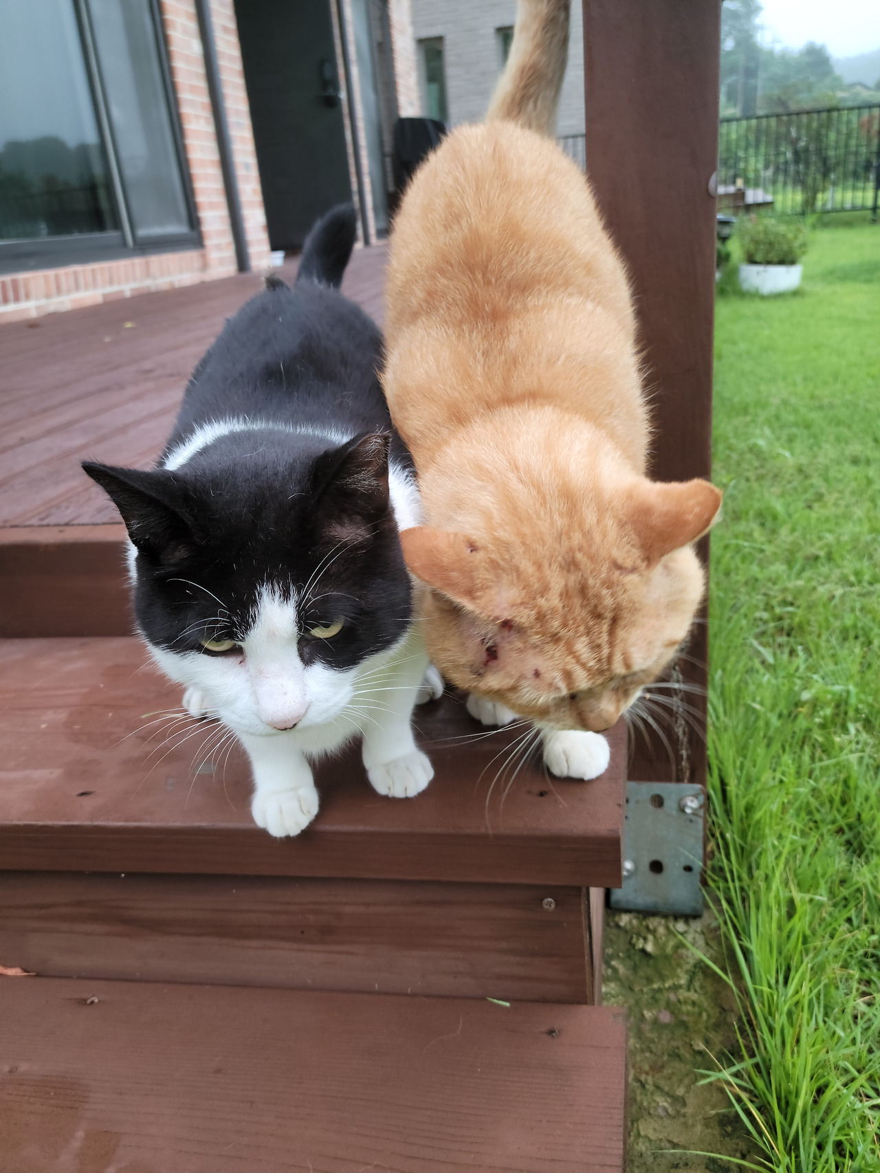 그런데 이 아이는 데크의 오른쪽 영역을 자기 구역이라 생각하고 턱시도나 치즈 1호도 거길 가서 공격하거나 경계하지은 않는데 요즘 새벽엔 심한 다툼소리( 길냥이 특유의 울음소리)가 나서 나가보면 이 애가 현관 앞으로 와서 치즈 1호와 대치를 하고 서로 내는 소리입니다. 거의 매일 새벽 2~3시쯤에 그럽니다.