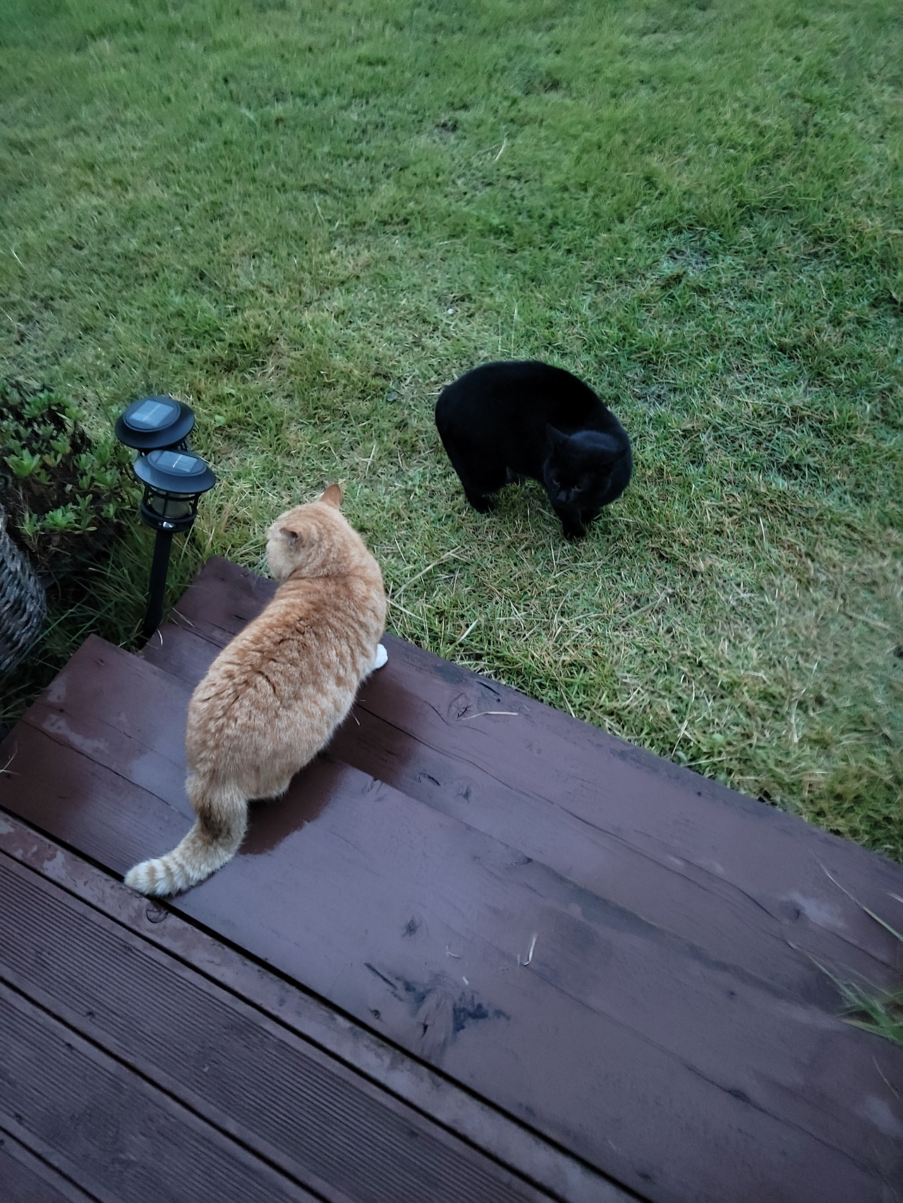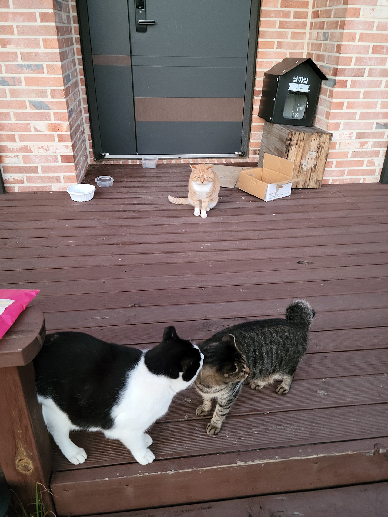 그간의 공통점은 모든 블랙이 들은 일단 '턱시도'와 '치즈 1호'에게 다 공격당하는 상태이며 그중 한 아이만 '호피'와 좋은 관계를 유지하는 것 같고 새로운 '턱시도 2호'와도 경쟁관계만 있는 줄 알았는데 새로운 아이인지 기존의 아이가 용기를 낸 건지 요즘 한 블랙이가 계속 데크 중앙을 침범하여 밥을 먹고 기존의 '턱시도'와 '치즈 1호'와 대치를 하며 신경전을 벌이고 있어 놀랍습니다.