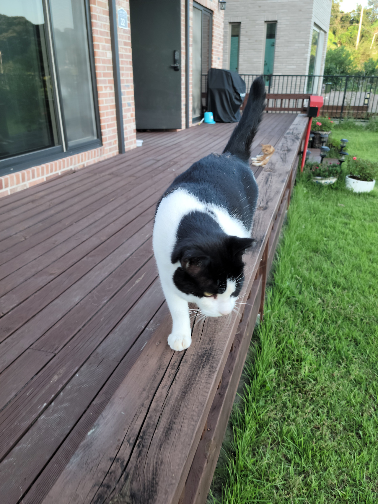 밤중에도, 새벽에도 , 아침에도... 데크 위에 올라와 '치즈 1호'의 경계 울음소리에도 아랑곳하지 않고 밀고 와서 대치하고 있습니다. 가끔 '턱시도'도 가세하지만 이 애가 강한 애라 그런지 공격은 하지 못하고 매일 울음소리와 하악질로 서로 경계를 합니다.