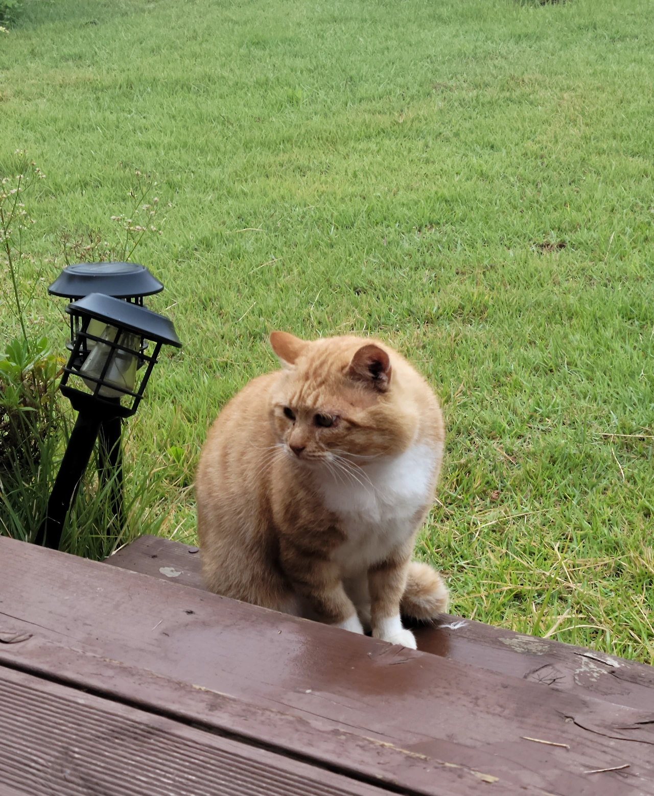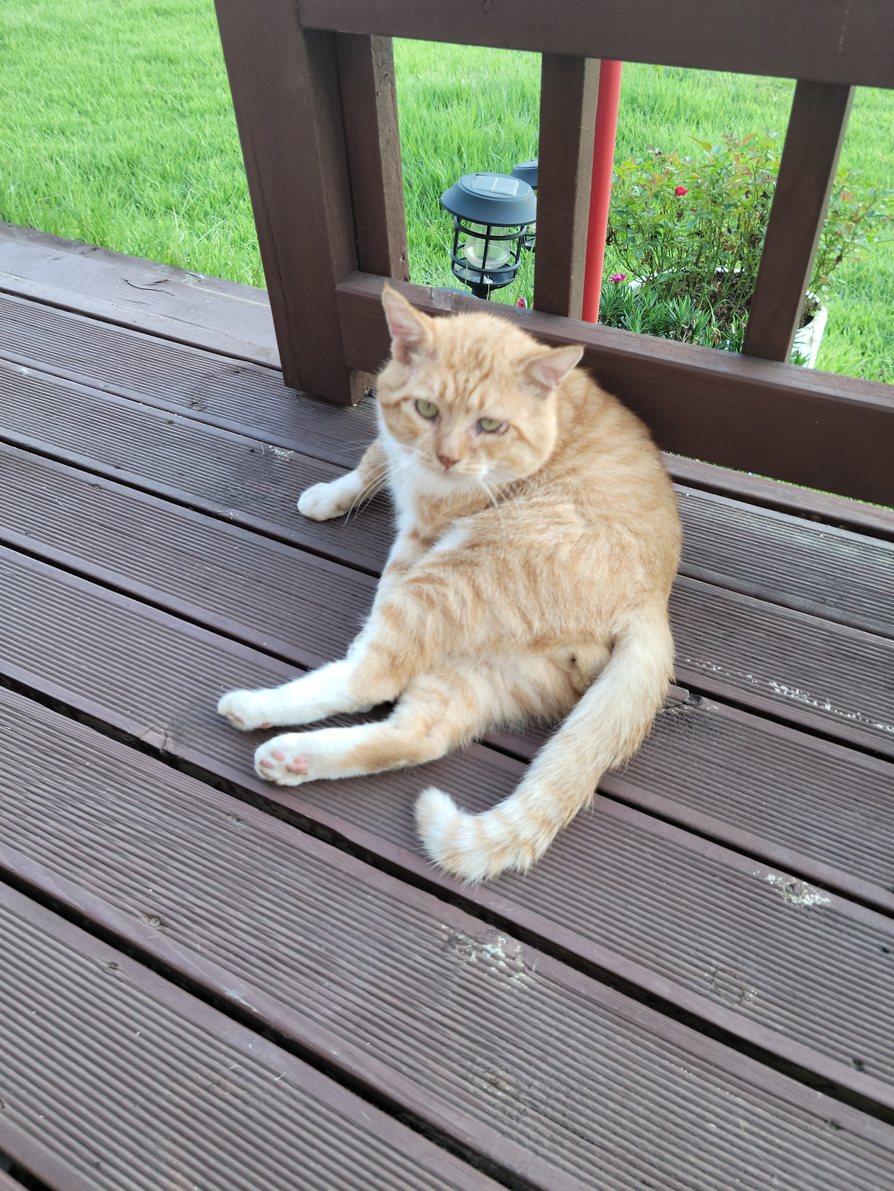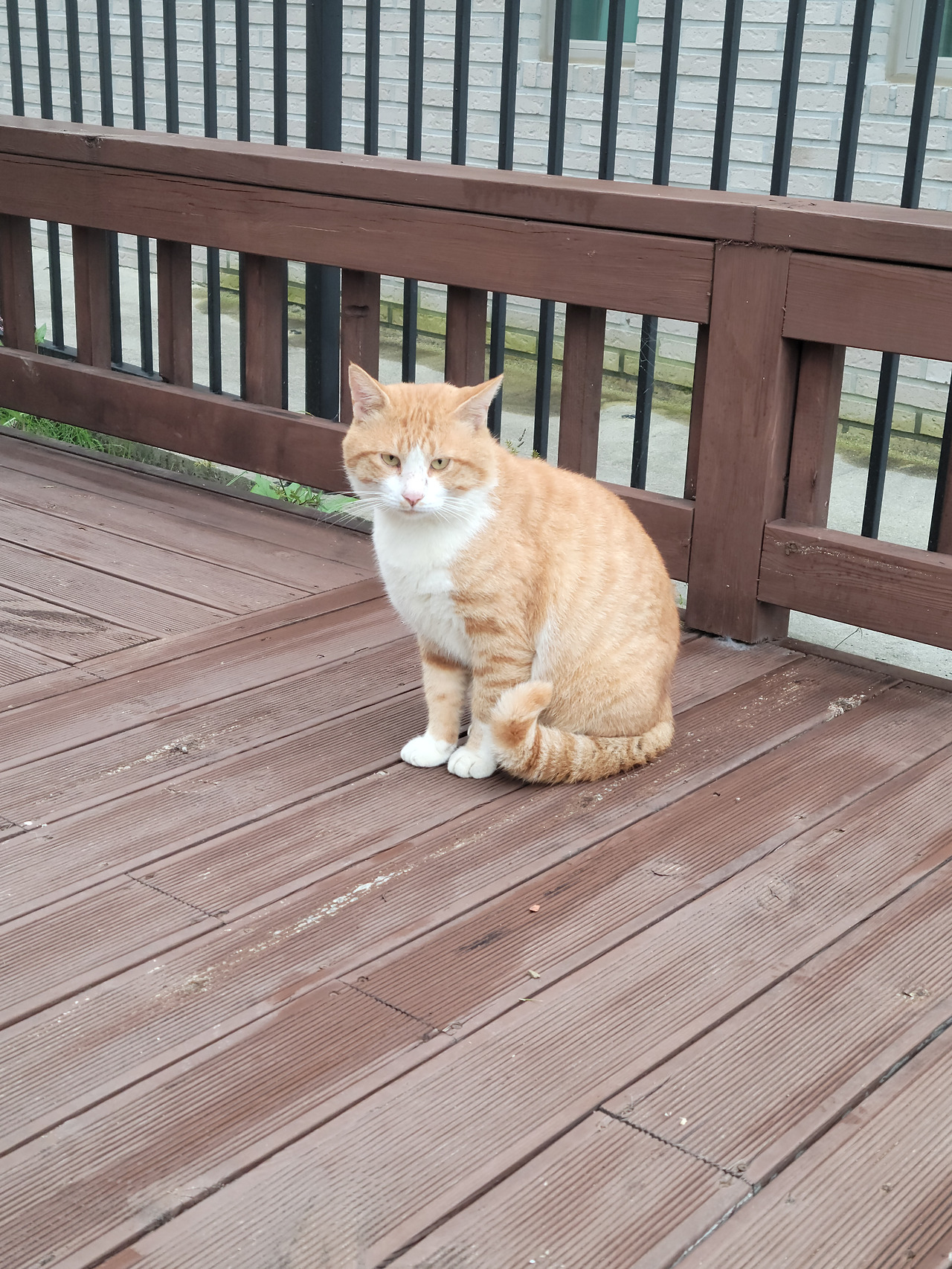 '치즈 2호'... 원래는 오른쪽 데크 영역만 사수하며 '턱시도'와 '치즈 1호'와 여름까지는 평화를 유지하고 있었는데 이 가을 들어 '치즈 1호'의 영역인 데크 중앙 현관으로 와서 '치즈 1호'와 밤에 와서 대치하고 싸우고 있습니다. 하지만 이 아이 영역인 데크 오른쪽은 '턱시도'와 '치즈 1호'가 침범하지 않고 있습니다