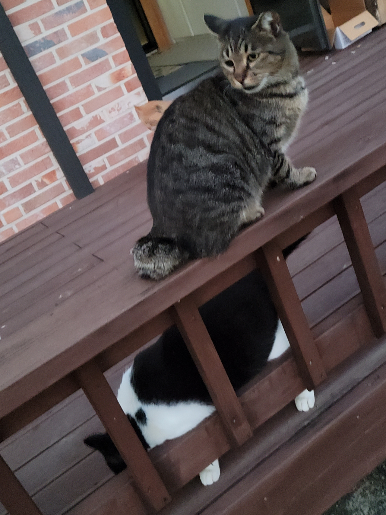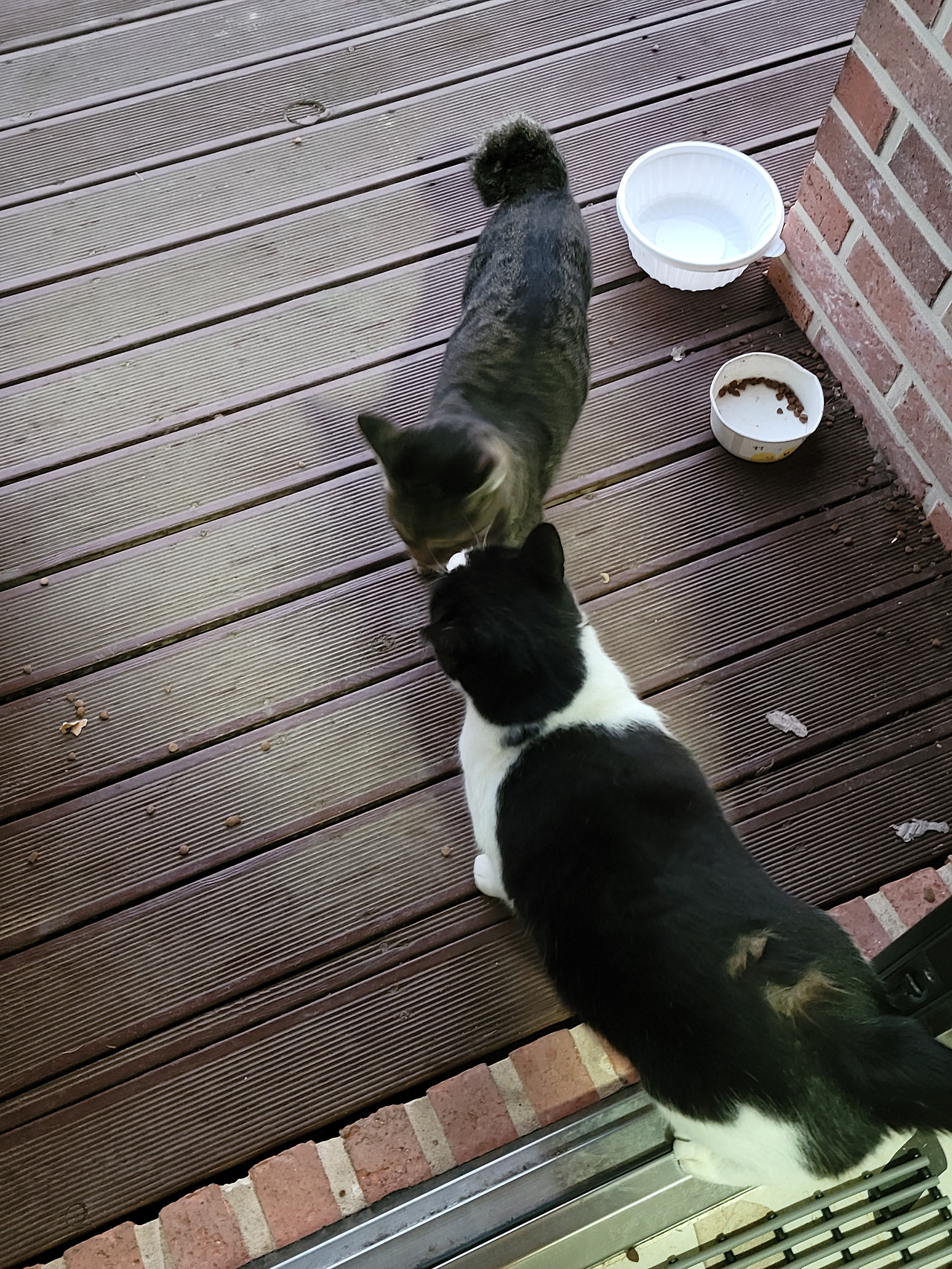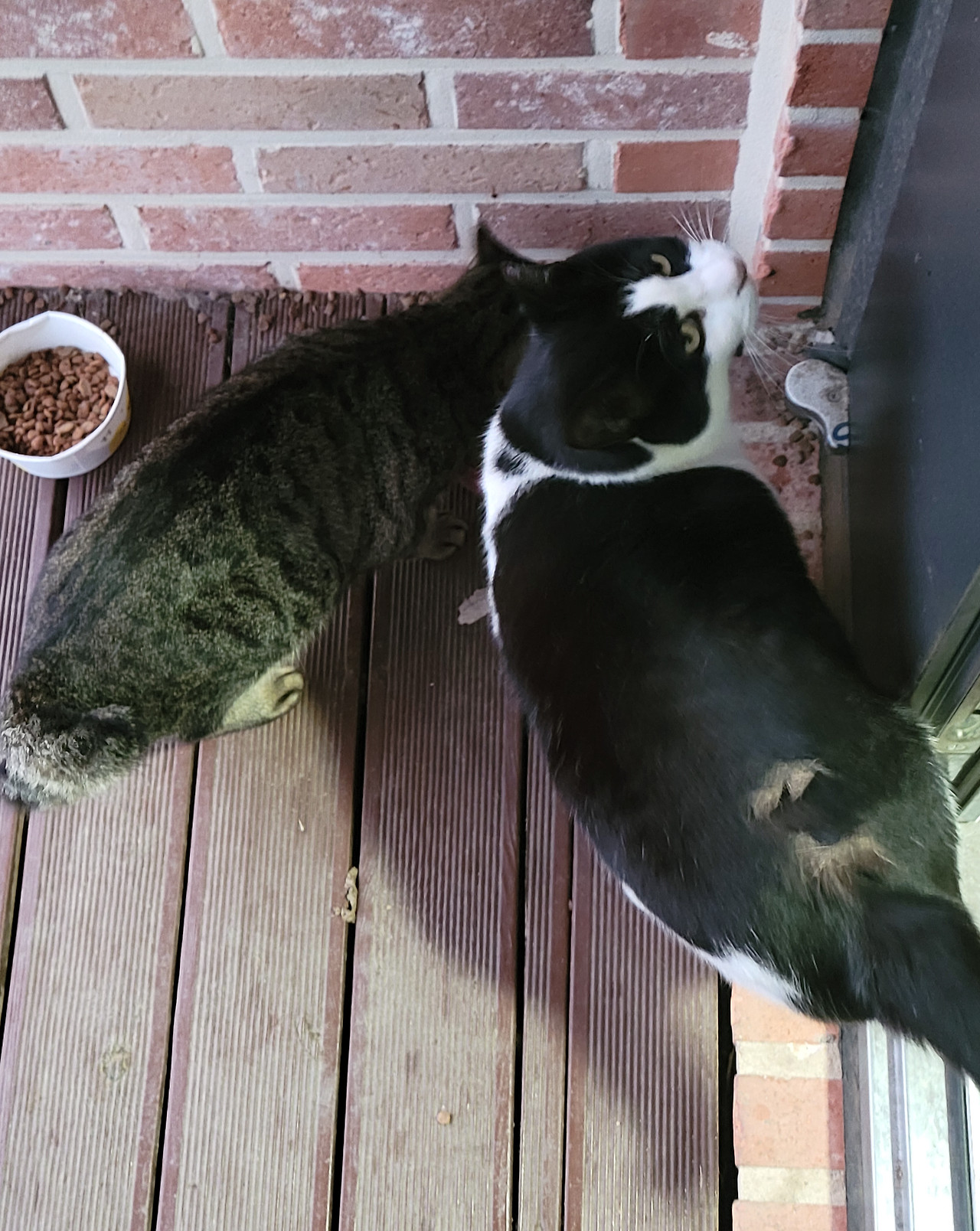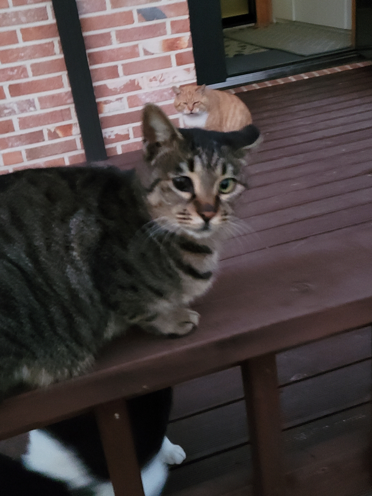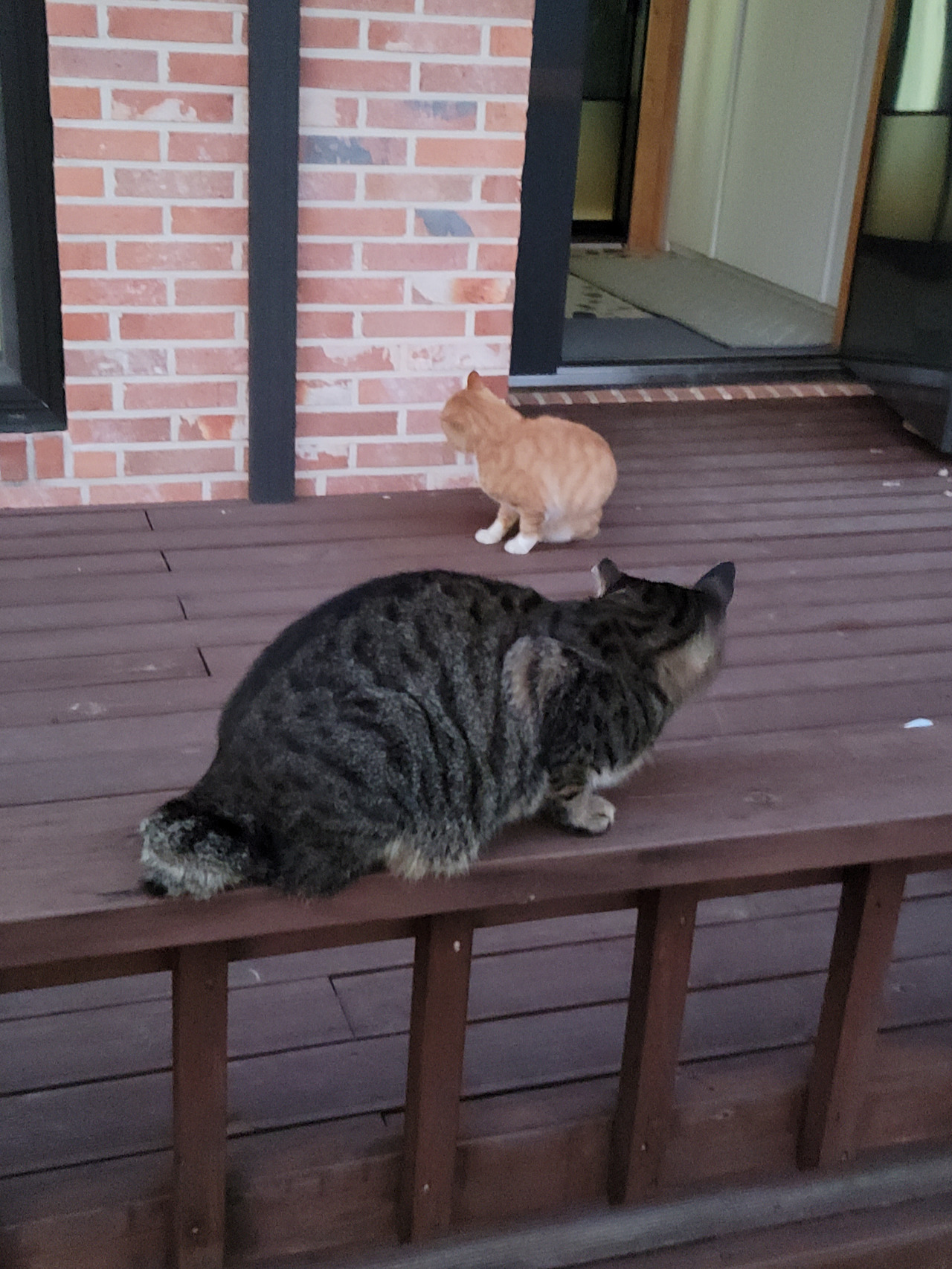지금까지는 이 데크에 올라오는 애는 턱시도가 막고 치즈 1호가 협공하여 전혀 얼씬을 못하는 구역을 버젓이 올라와 밥을 먹고 저렇게 두 아이를 가볍게 무시 또는 제압하는 게 너무나 신기합니다.