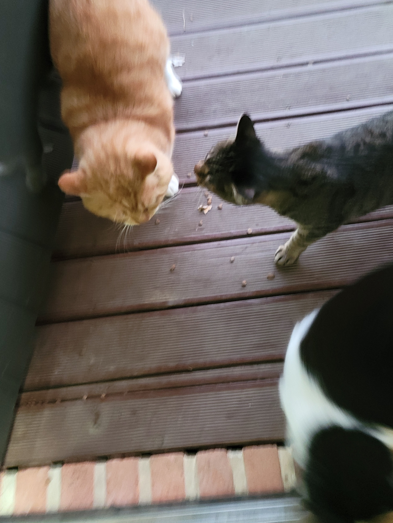 밥을 다 먹더니 아슬렁 거리며 이 구역 제왕 턱시도에게 가 인사인지 기선 제압인지 합니다. 둘이 코인사같은걸 나누는 건지 뭐 얼굴을 마주 하더니 이내 턱시도가 물러 납니다. 그리고 이번엔 치즈 1호에게 가더니 역시 얼굴을 보고 냄새를 맡고 하는데 웬일인지 치즈 1호가 몸을 사리며 피하는 듯하고 이 새로운 애는 두 애들을 이렇게 스캔하더니 가볍게 제압? 또는 무시하고 그냥 이 구역을 어슬렁 거립니다.