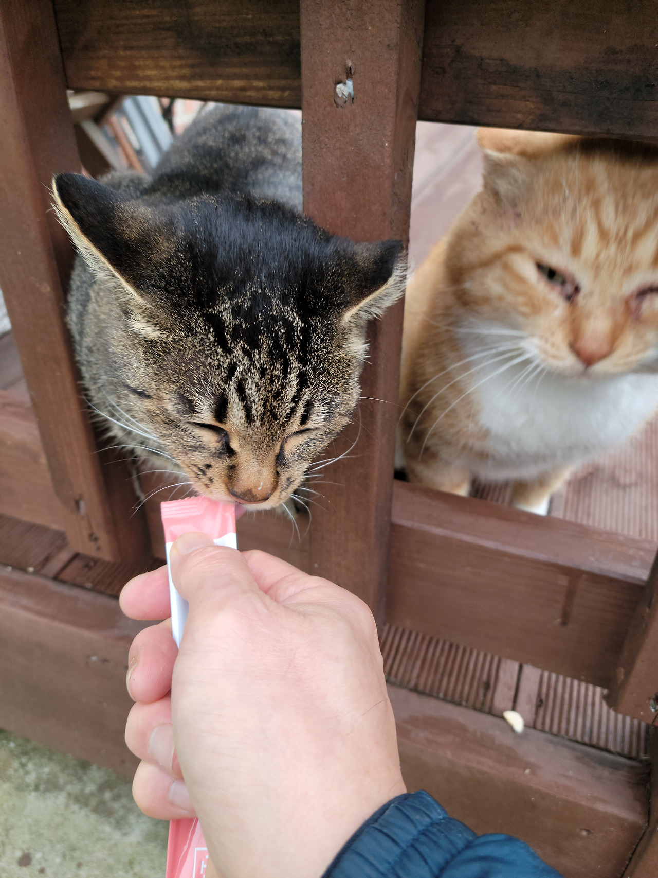 식사를 마치고 후식으로 준 추르를 받아먹는 최강신예는 원래 치즈 1호가 먹고 있는데 머리를 내밀어 중간에 가로채기를 하며 먹었고요.