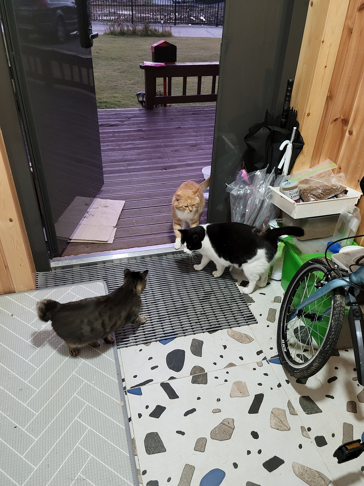 중앙현관의 턱시도와 치즈 1호, 데크 오른쪽의 치즈 2호, 자두네 집 테이블 위의 호피, 자두네 집 지붕 위