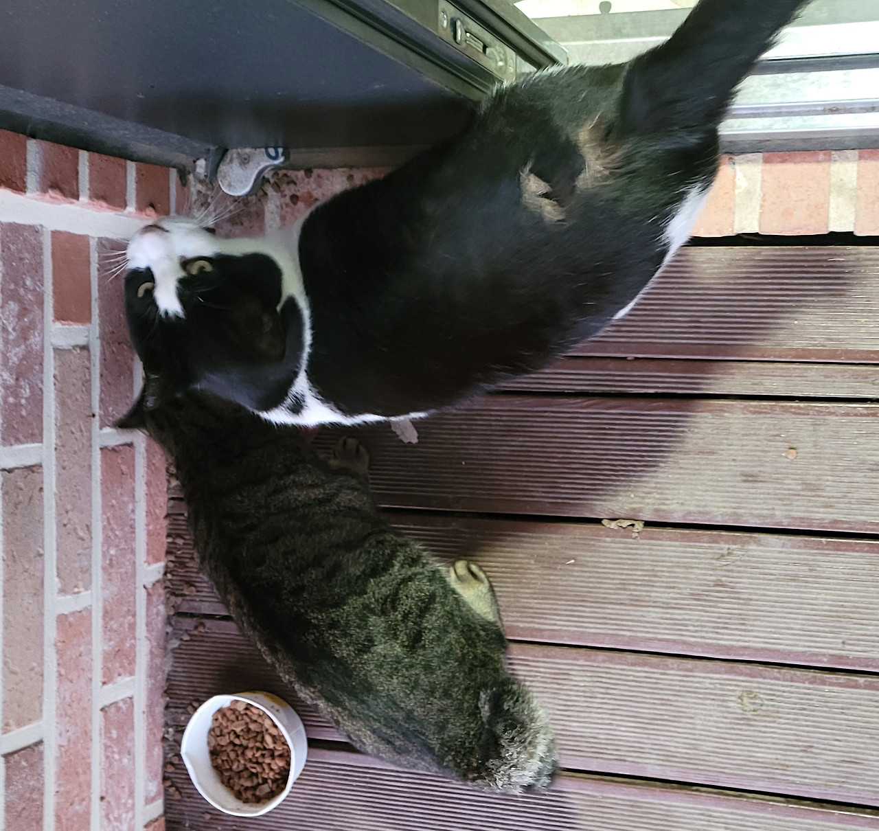 원래 추르를 줄 때 턱시도가 먹고 있을 때 치즈 1호가 머리를 쑥 디밀고 들어 오면 턱시도가 뒤로 물러나고 치즈 1호가 먹는데 오늘은 반대로 되었습니다