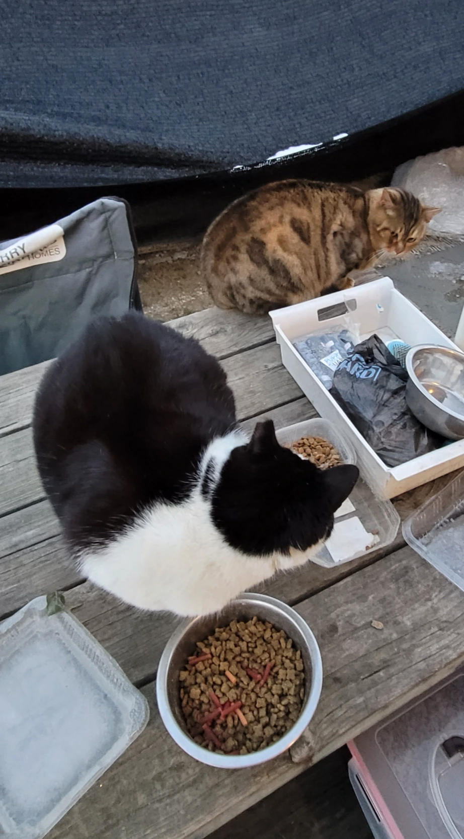 대개는 마당 한편 주차구역인 곳에서 밥을 기다리는데 차 밑에 숨어 있다가 밥을 주면 나와서 두리번거리며 밥을 먹다가 턱시도가 나타나면 도망갑니다. 내 발자국 소리만 들어도 숨거나 도망가는데 그래서 일부러 멀리 밥을 주고 옵니다. 이 애는 블랙이 3호가 나타날 때 같이 와서 차 밑에 숨어 있다가 3호가 데크 위에서 소란을 필 동안 마당 한편에 준 밥을 먹고 갑니다. 턱시도가 쫓아내면 옆집으로 도망가는데 그 옆집 애가 고양이들을 좋아해서 아마도 먹을 걸 챙겨주는데 거기로 도망을 가나 봅니다. 그러나 그 집은 주말 세컨드하우스라 일상을 챙겨주지 못하고 주말에만 사람이 있는 집입니다. 안타깝게도....