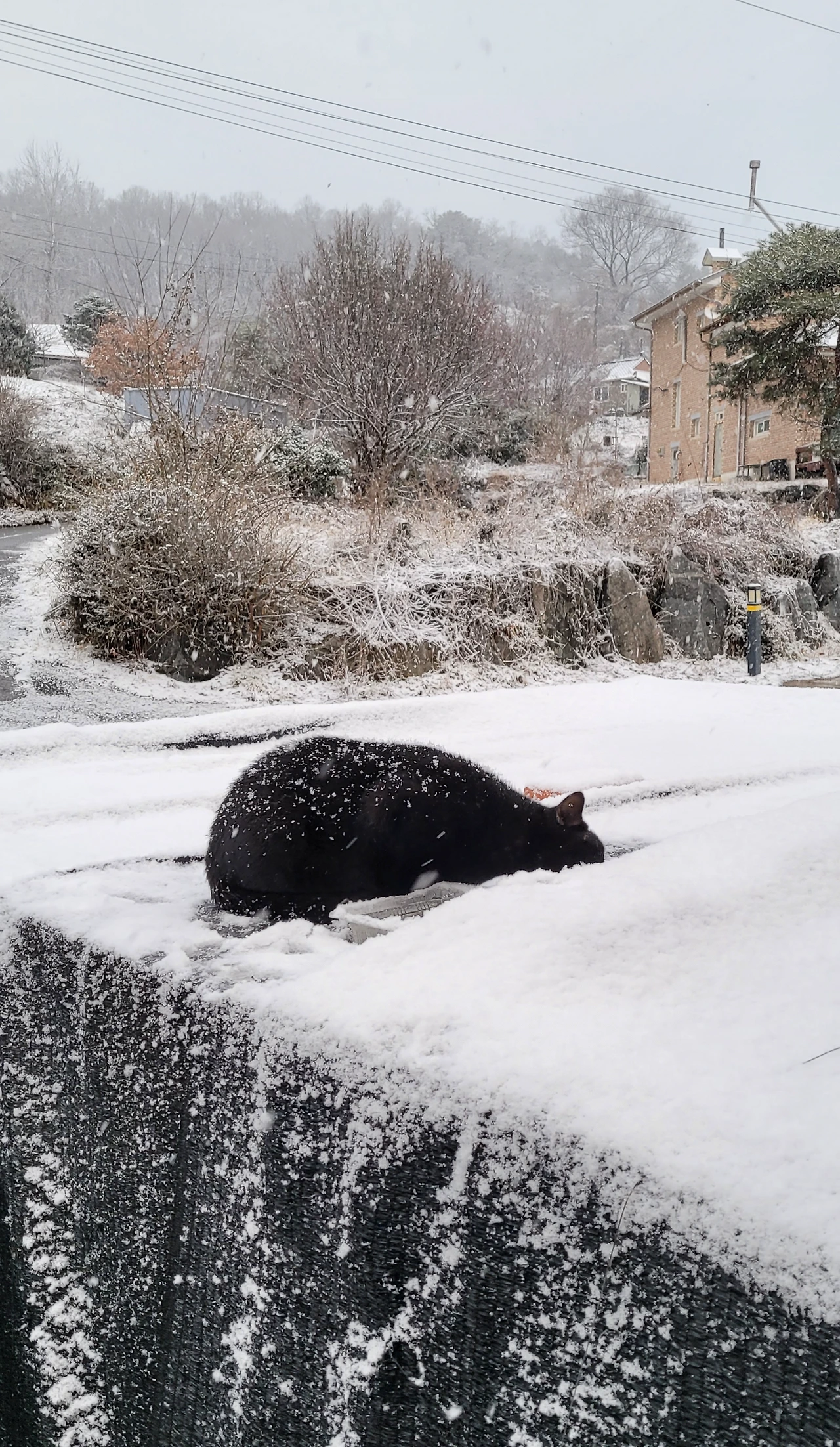 눈이 소복소복 온 날 아침에 밥을 주러 나왔더니