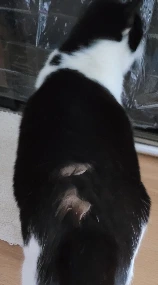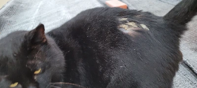 보니 왼쪽 옆구리에 털들이 서로 엉커 붙어 있는데 마치 누군가 대량으로 접착제를 발라 놓은 듯하는 겁니다.(예전에 턱시도도 허리에 접착제가 발라져 있어 엉켜 붙은 털을 일부 가위로 잘라주었는데)이 애도 그런 겁니다. 그런데 이 애는 그걸 떼어