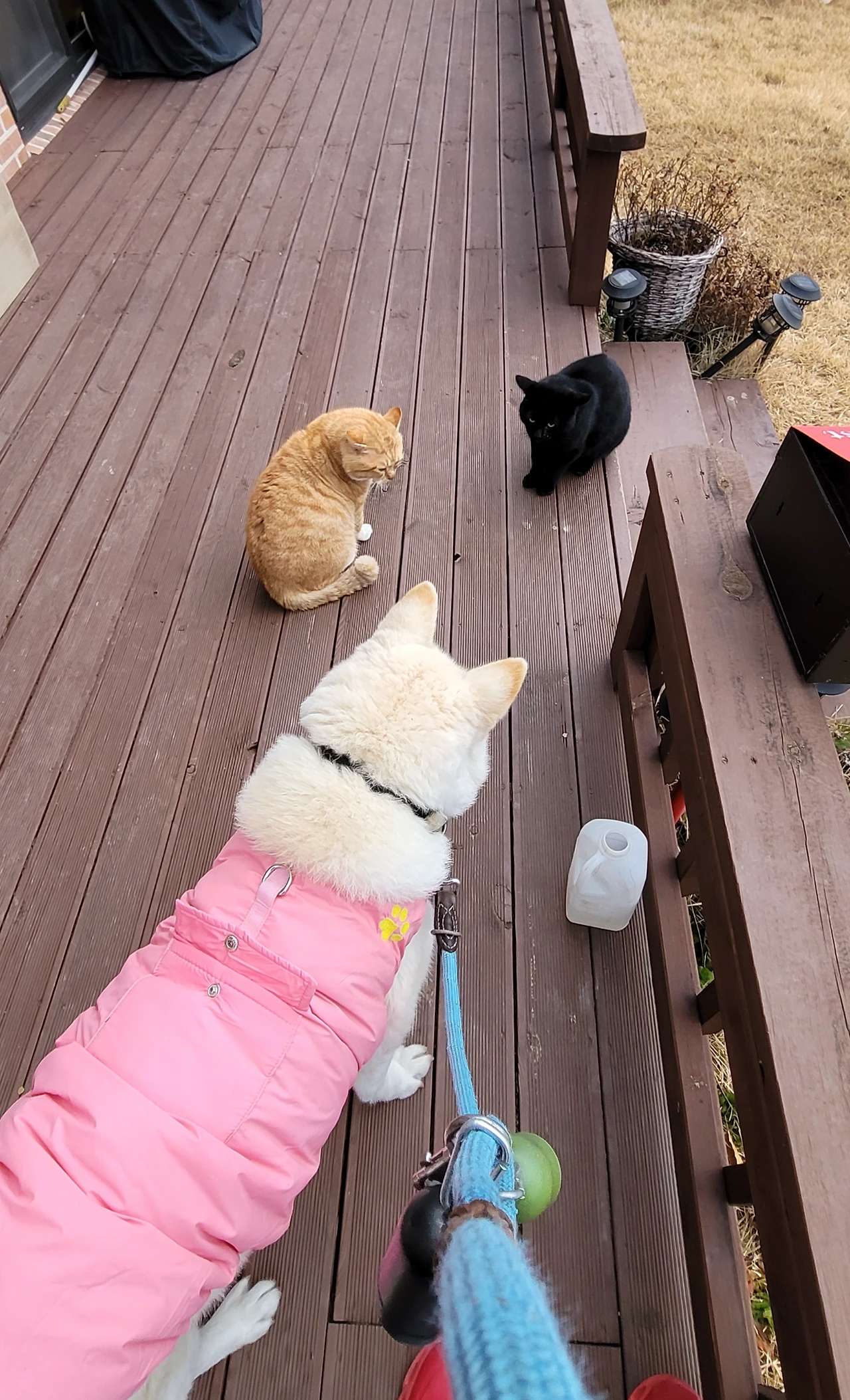 그랬더니 어제 아침 자두와 호두가 산책을 하고 들어 오니 데크 위에 웅크리고 있는 겁니다.