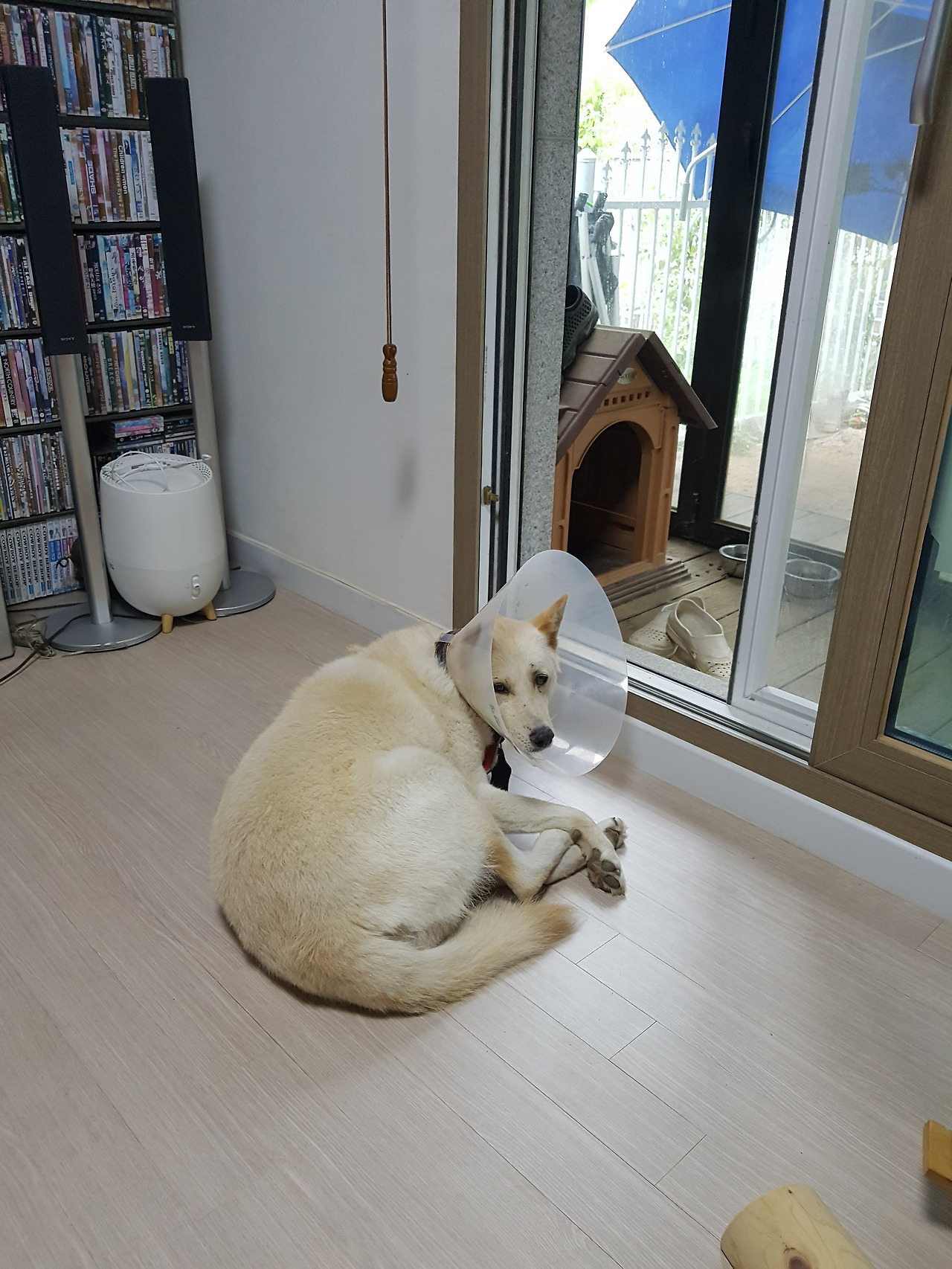 애들이 싸울 때 내가 모른 체하면 1~2분 새 금방 끝나버리거나 자두가 살구를 제압하여 밑에 깔리게 하면 끝나는데 이번엔 제법 큰 싸움이 되었다. 그래서 자두를 붙잡고 있다 보니 이번엔 살구가 자두를 물어 자두 눈가에 상처가 생겼다. 병원에서 약을 받고 칼라를 해서 상처를 건드리지 못하게 해 두었는데 그랬더니 저렇게 세상 불쌍한 표정으로 쳐다보고 있다. 그런데 문젠 싸움의 원인을 못 찾는다는 것이다(그네들 사이에선 이유가 있겠지만 내가 파악을 못하는 거다) 그냥 표면적인 현상만 보면 자두는 무슨 불만이 있으면 살구한테 해코지(?)를 하거나 뭔가의 분풀이를 살구한테 하는 것 같다. 게다가 살구가 피하지 않고 대들거나 앙앙거리며 시비를(?) 걸면 자두한테 물리곤 하는 거다. 이상한 건 살구는 그렇게 물리면서도 도망가거나 피하지 않고 대들다 물린다는 거...(진돗개들이 그런단다) 그게 내가 파악한 전부다... 문제는 이걸 미연에 방지할 수 없다는 것이고 제일 좋은 건 분리해서 키우는 거겠지만 사정상 분리 사육이 안 돼서 같이 키울 수밖에 없는 것이다. 그렇게 평온 상태를 유지하다가 어느 날 싸움이 나곤 하는 게 반복되는 것이다.