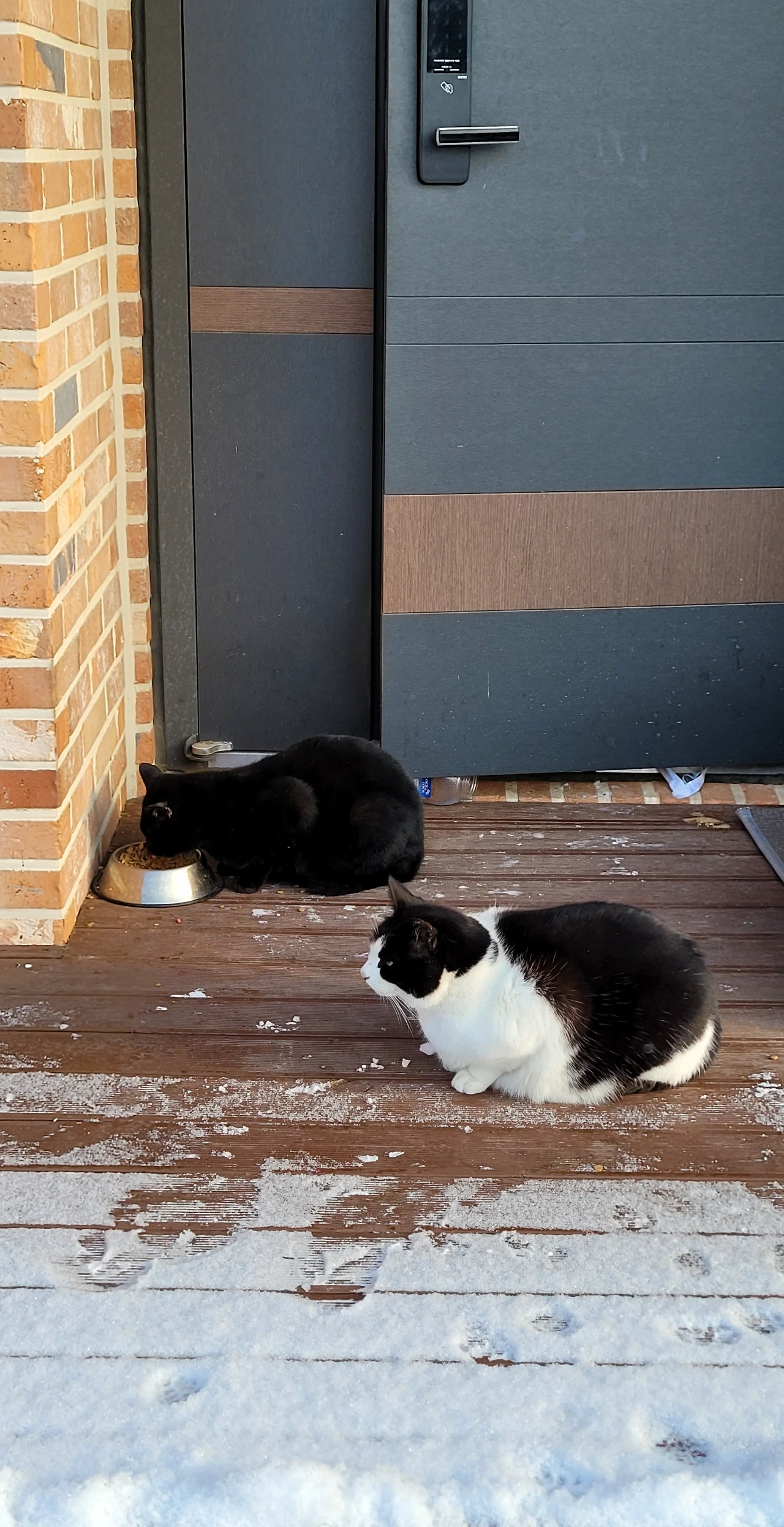 현관 안에 들어와 밥도 먹습니다. '턱시도'는 내가 있을 땐 하악질도 하며 경계를 하기도 하지만 그냥 이 변화를 받아들이고 같이 지내려 한 건지 혼자는 감당이 안 돼서 그런 건지 와서 밥을 먹어도 모른 척하기도 하고 합니다. 그는 권력의 중심추가 바뀌는 걸 받아들이고... (대문 사진도 둘이 데크에서 간식을 먹고 있는 상황)