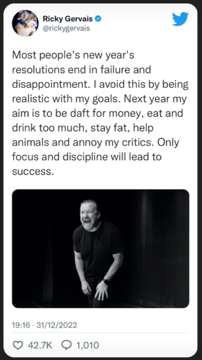 대부분의 사람들의 새해 결심은 실패와 실망으로 끝난다. 나는 이를 피하기 위해 현실적인 목표를 세운다. 내년의 나의 목표는 돈 때문에 바보가 되고, 과식과 과음을 하고, 뚱뚱한 몸매를 유지하며, 동물들을 돕고 비평가들을 약 올리는 것이다.