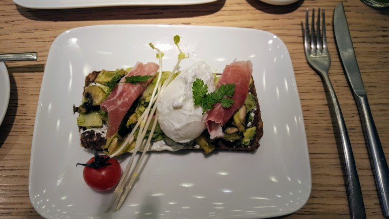 저 음식의 베이스는 딱딱한 곡물 빵이 깔려있고, 그 위에 허브와 소스를 버무려 얇게 발려있는데다 버섯, 아보카도가 올라가있고 부드러운 아보카도 위에 약간의 짭쪼름한 맛을 내줄 살로미같은 얇은 햄이 있고, 부드러운 수란이 가운데 올라가있다. 그리고 처음엔 이해할수 없었던 숙주나물 몇가닥. 이게 다 이유가 있었다.