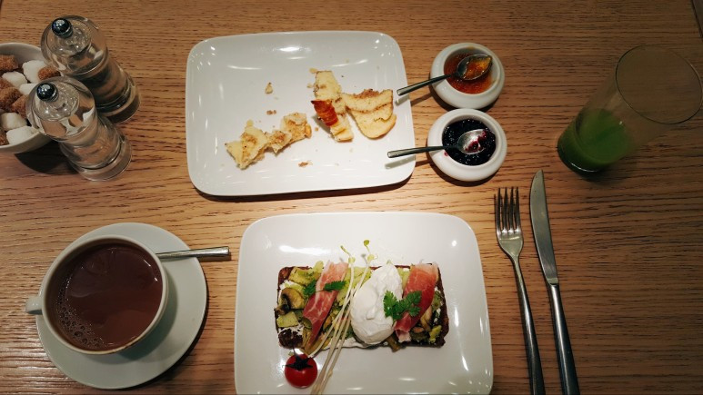 메뉴판을 주는데 브런치메뉴는 네 개정도 있었다. 나는 구글에서 보았던, 맛있어보이는 수란과 아보카도가 함께있던 브런치를 선택했다. 빵은 브리오슈가 수제잼과 나오고, 쥬스는 이곳에서 정말 신선하고 건강하게 만든듯한 비타민,디톡스,오렌지? 중 하나를 고르라고 하는데 나는 디톡스를 골랐다. 차는 쇼콜라.