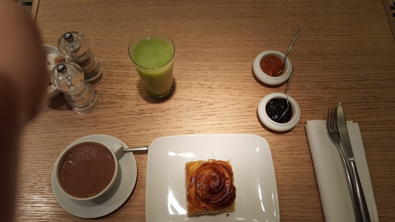 제일 먼저 나온 브리오슈와 음료, 쥬스. 같이 나온 디톡스쥬스는 정말, 아침에 먹으면 머리가 싹 맑아지는 그런 맛? 디톡스주스 신청하면 왜 비트랑 그린스무디에 레몬즙 섞어서 오는 그런맛? 정말 내 피가 맑아지는 느낌이 드는 맛인데, 개인적으론 좋아하는 맛이라 다 마셨다. 이 레스토랑은 세가지맛 쥬스를 미리 준비해놓고 주문하면 바로바로 따라주는것 같다.