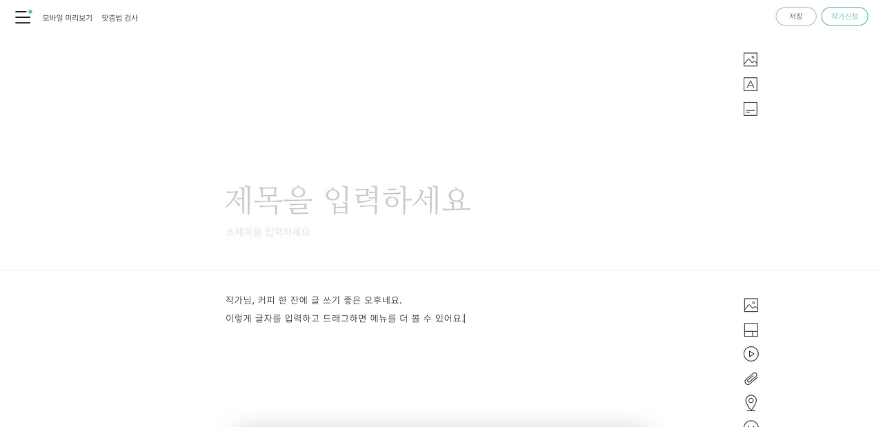 아이콘 세 개만이 휑뎅그렁하게 놓인 회색 명조체의 '제목을 입력하세요'라 쓰인 제목란, 그 아래 한 줄짜리 디바이더, 본문란 아이콘 여덟 개가 전부인.. 사진이나 영상같은, 어떤 다른 '꼼수'도 쓰지 말고 제대로 각 잡고 글만 써보라는 듯 판을 깔아 둔 브런치의 UI에 새삼 놀랐다.